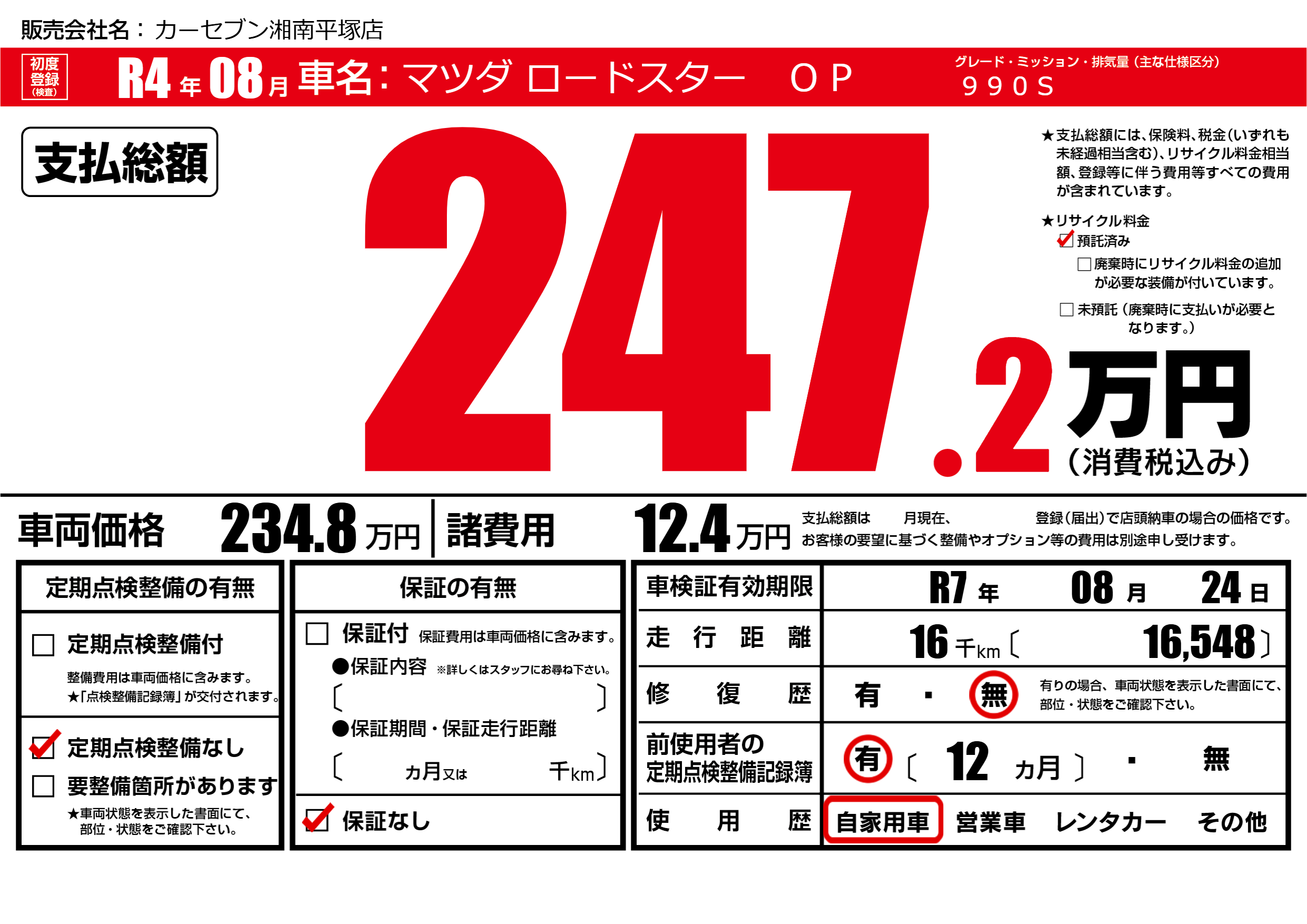 | 車名 | マツダ ロードスター OP | グレード ミッション 排気量 |