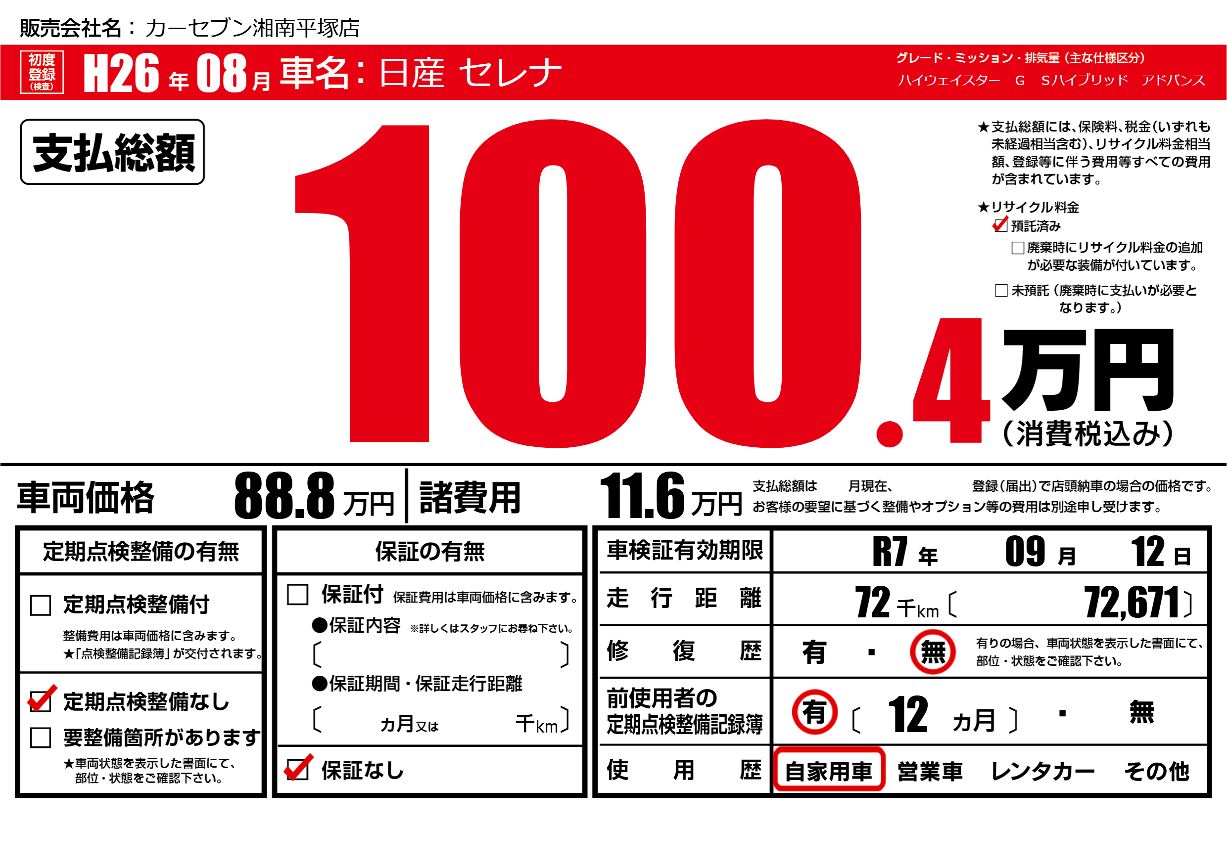 | 車名 | 日産 セレナ | グレード ミッション 排気量 |