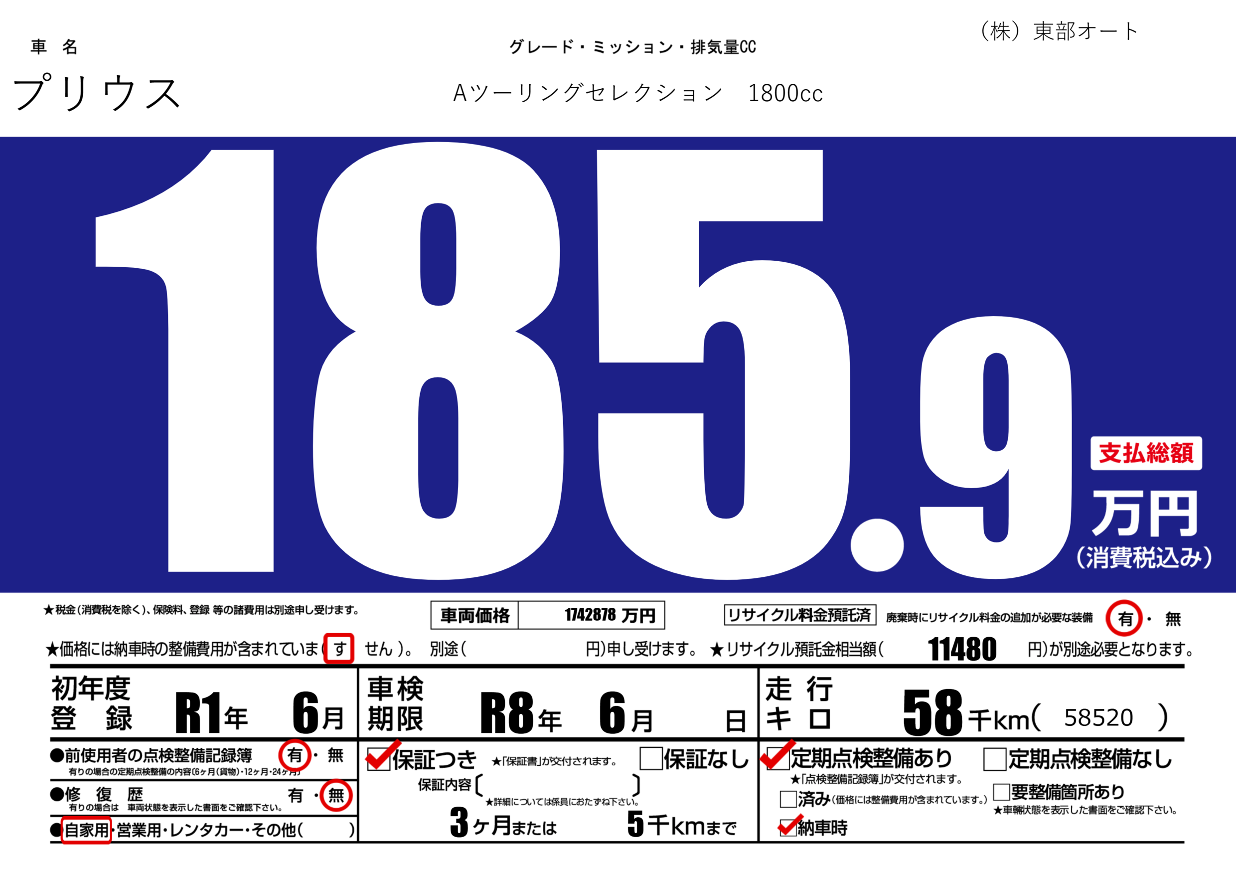 | 車名 | プリウス | グレード ミッション 排気量 |