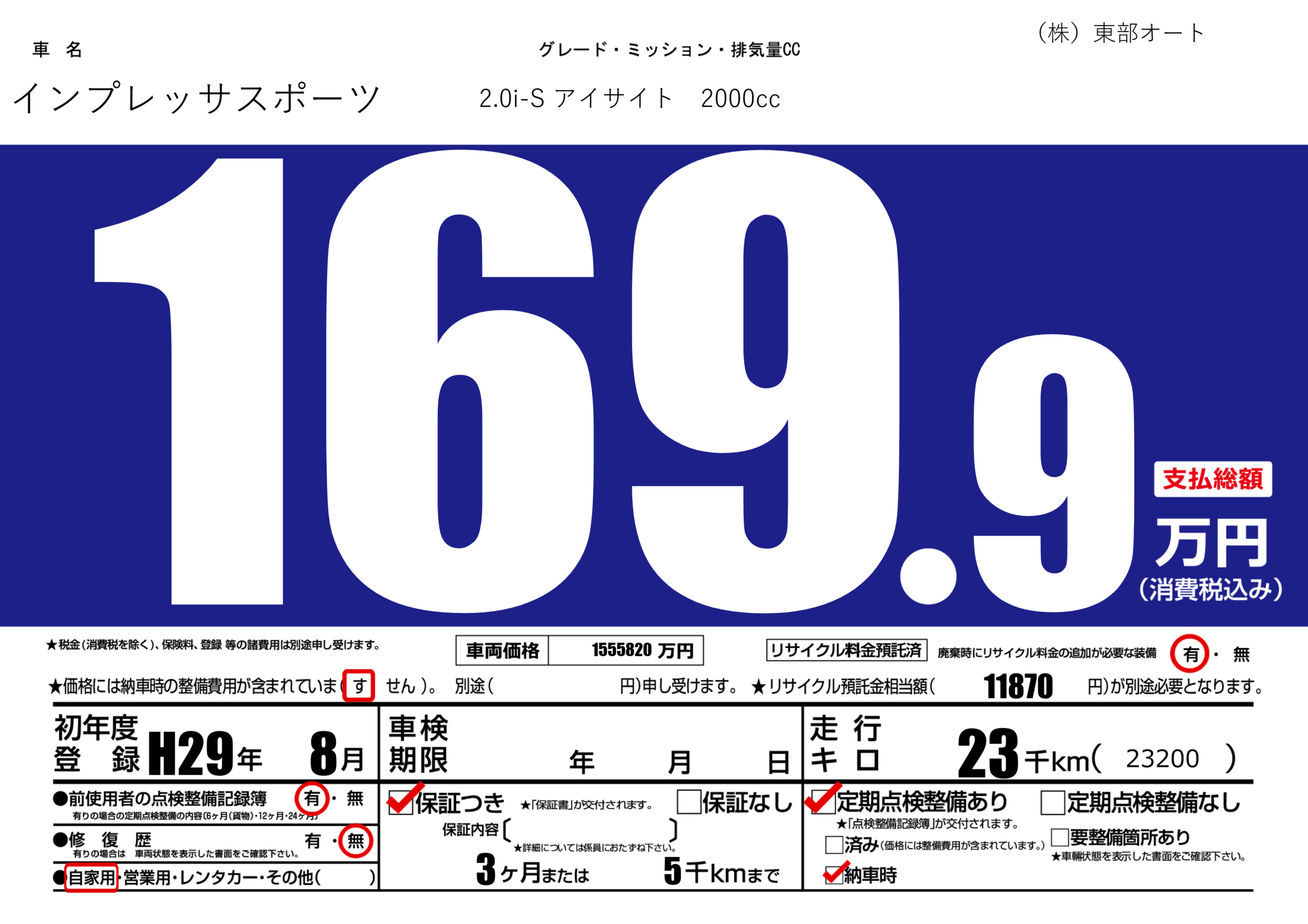 | 車名 | インプレッサスポーツ | グレード ミッション 排気量 |