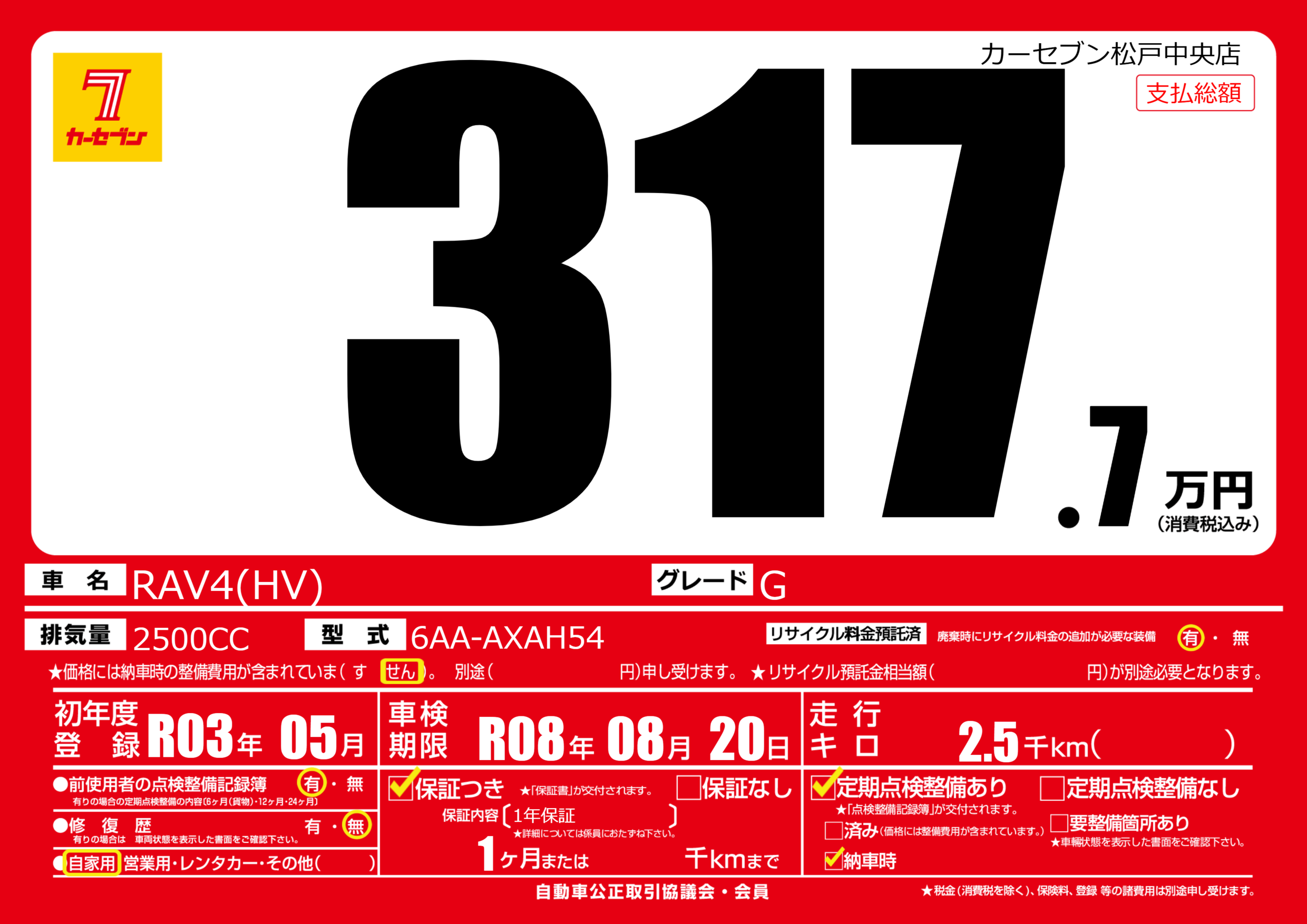 | 車名 | RAV4(HV) | グレード ミッション 排気量 |