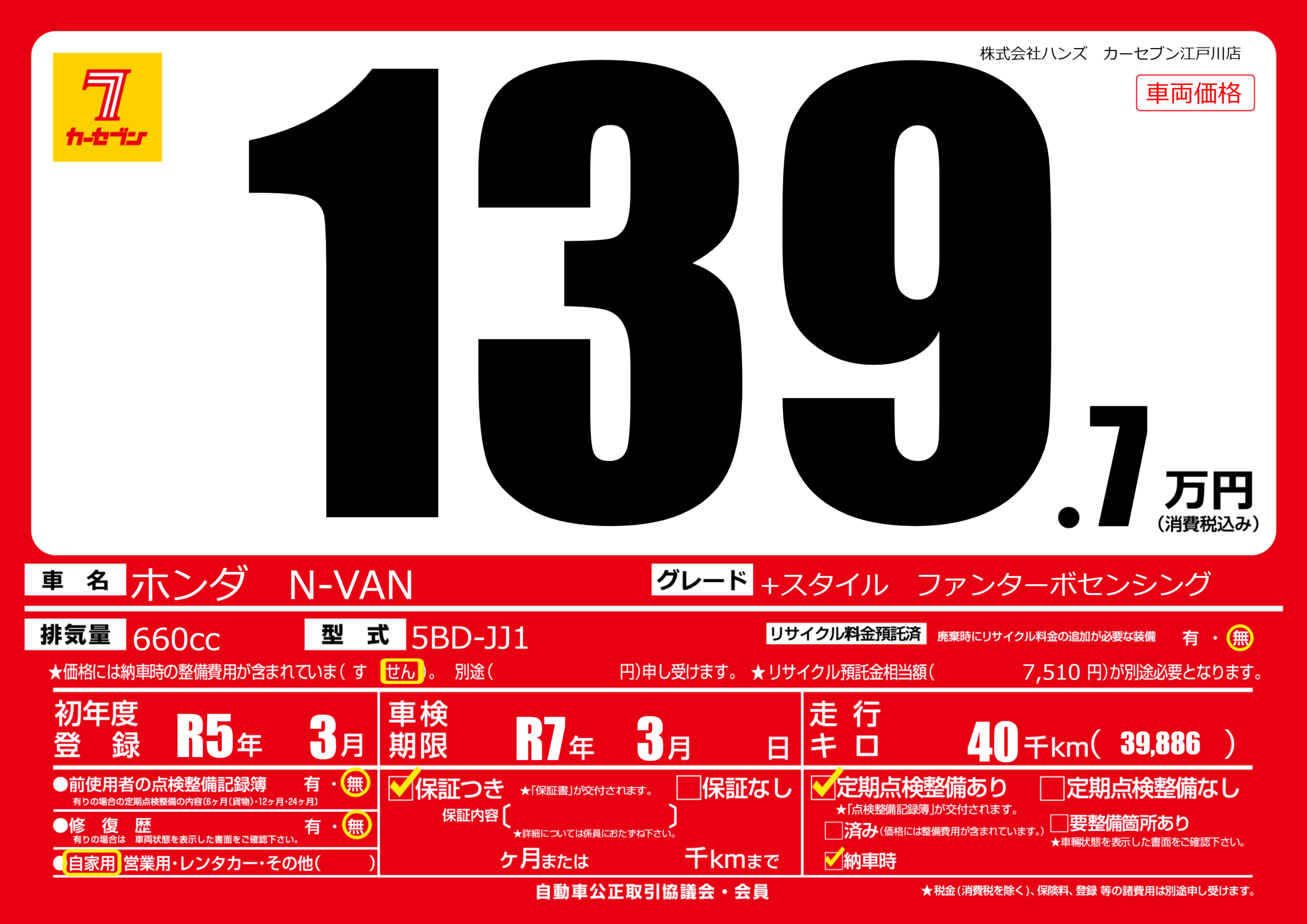 | 車名 | ホンダ N-VAN | グレード ミッション 排気量 |