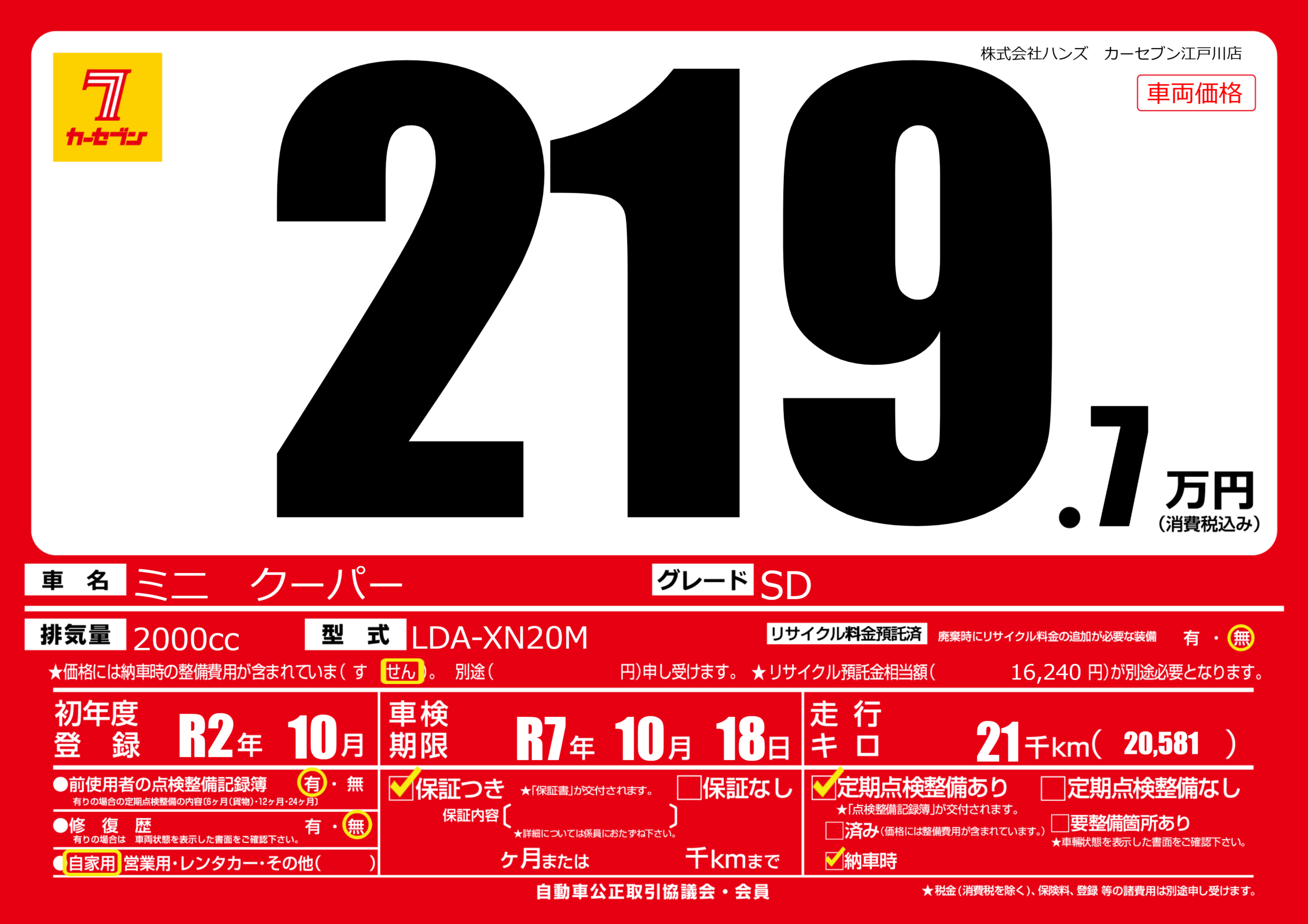 | 車名 | ミニ クーパー | グレード ミッション 排気量 |
