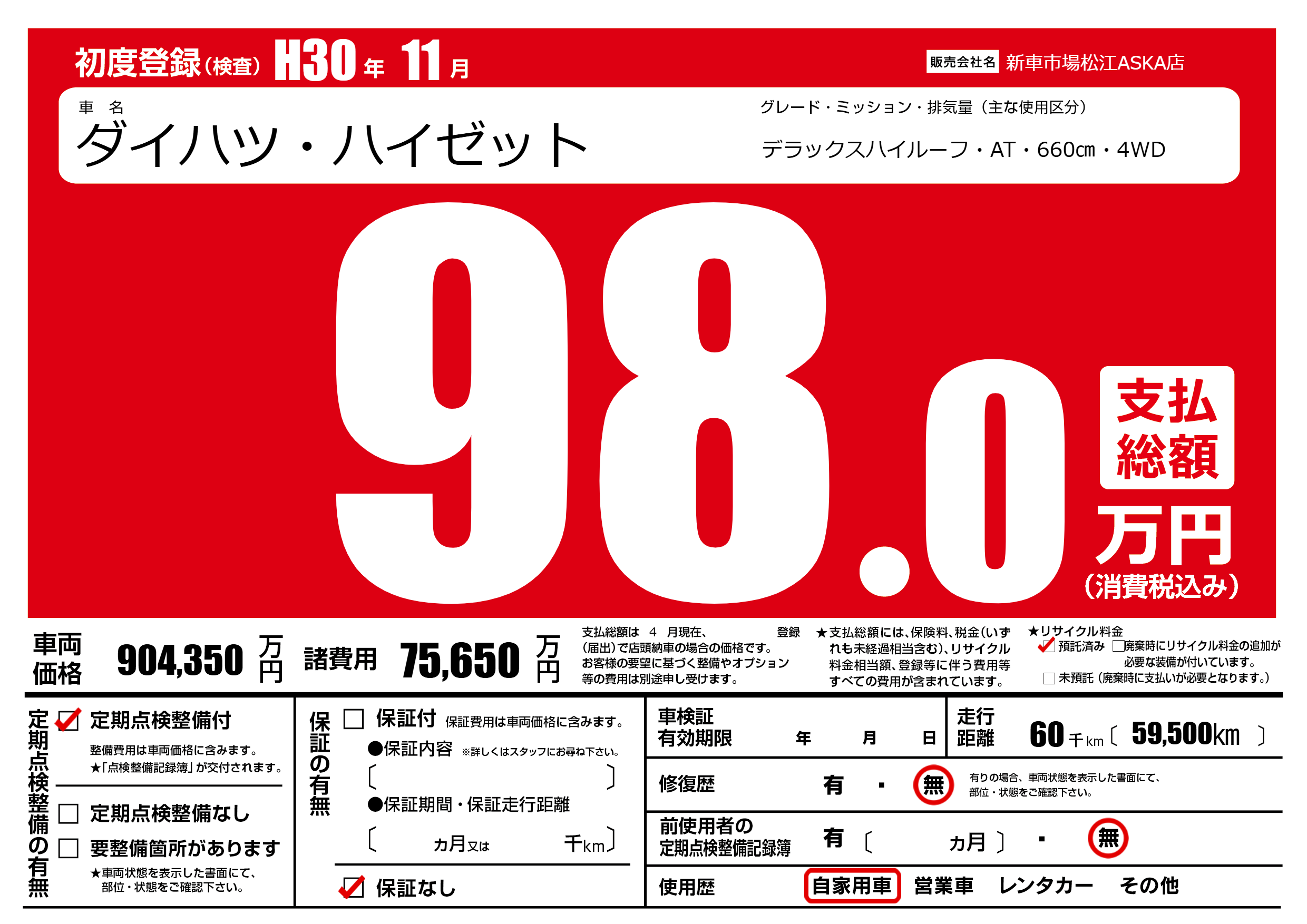 | 車名 | ダイハツ・ハイゼット | グレード ミッション 排気量 |