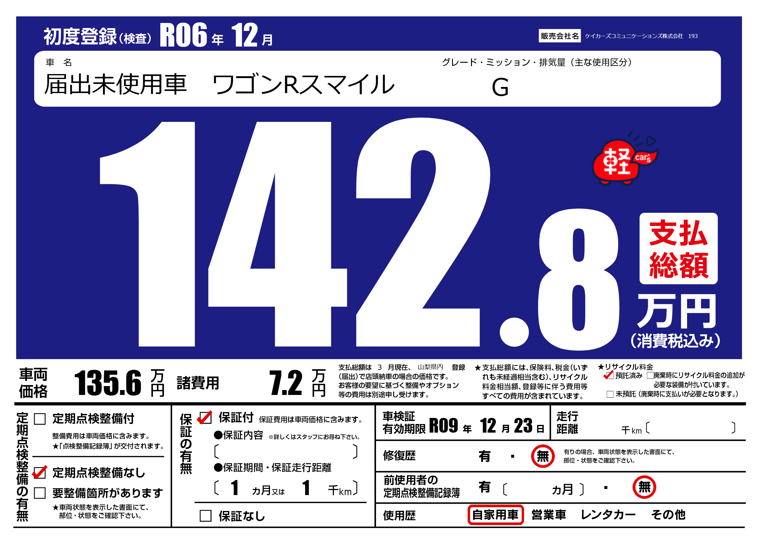 | 走行キロ | - | 初年度登録 | R06年12月 |