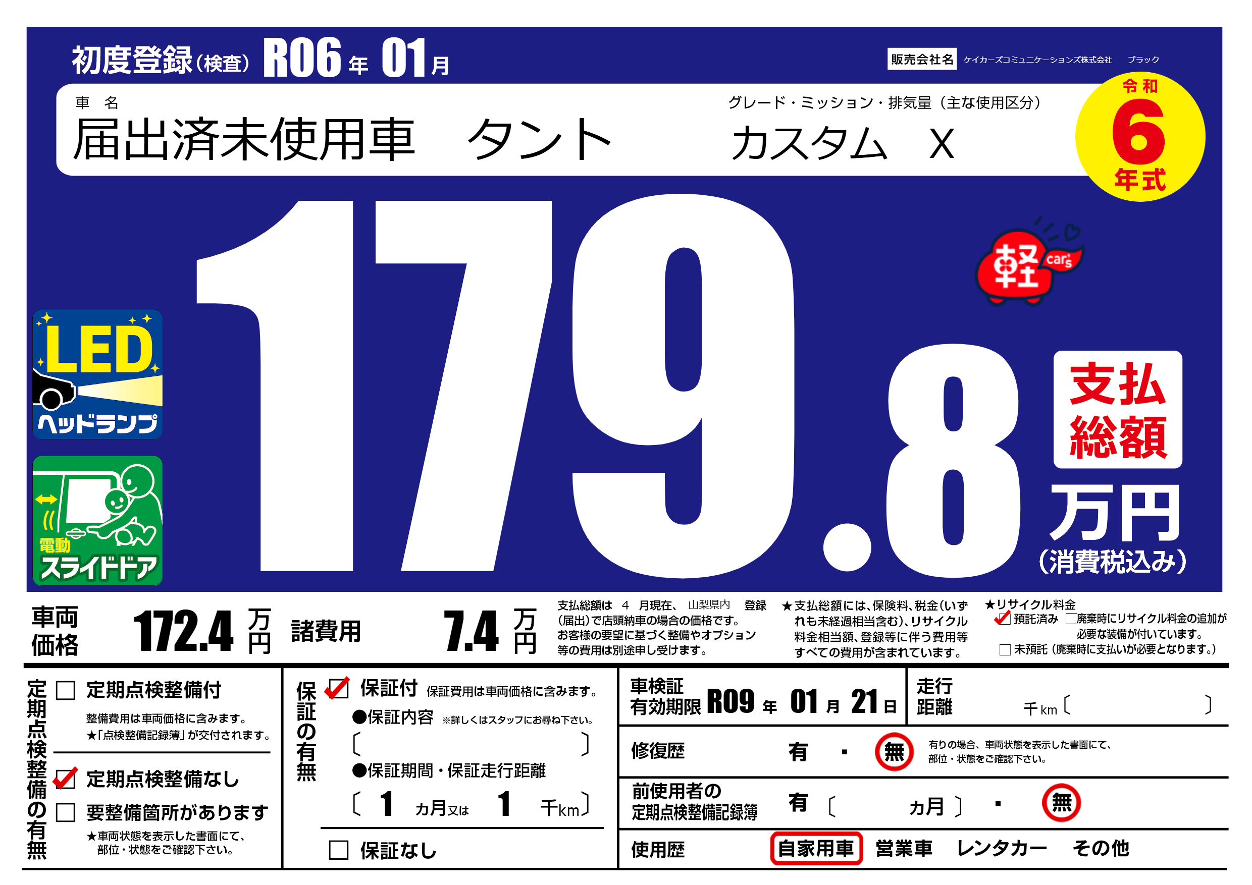 | 車名 | 届出済未使用車 タント | グレード ミッション 排気量 |