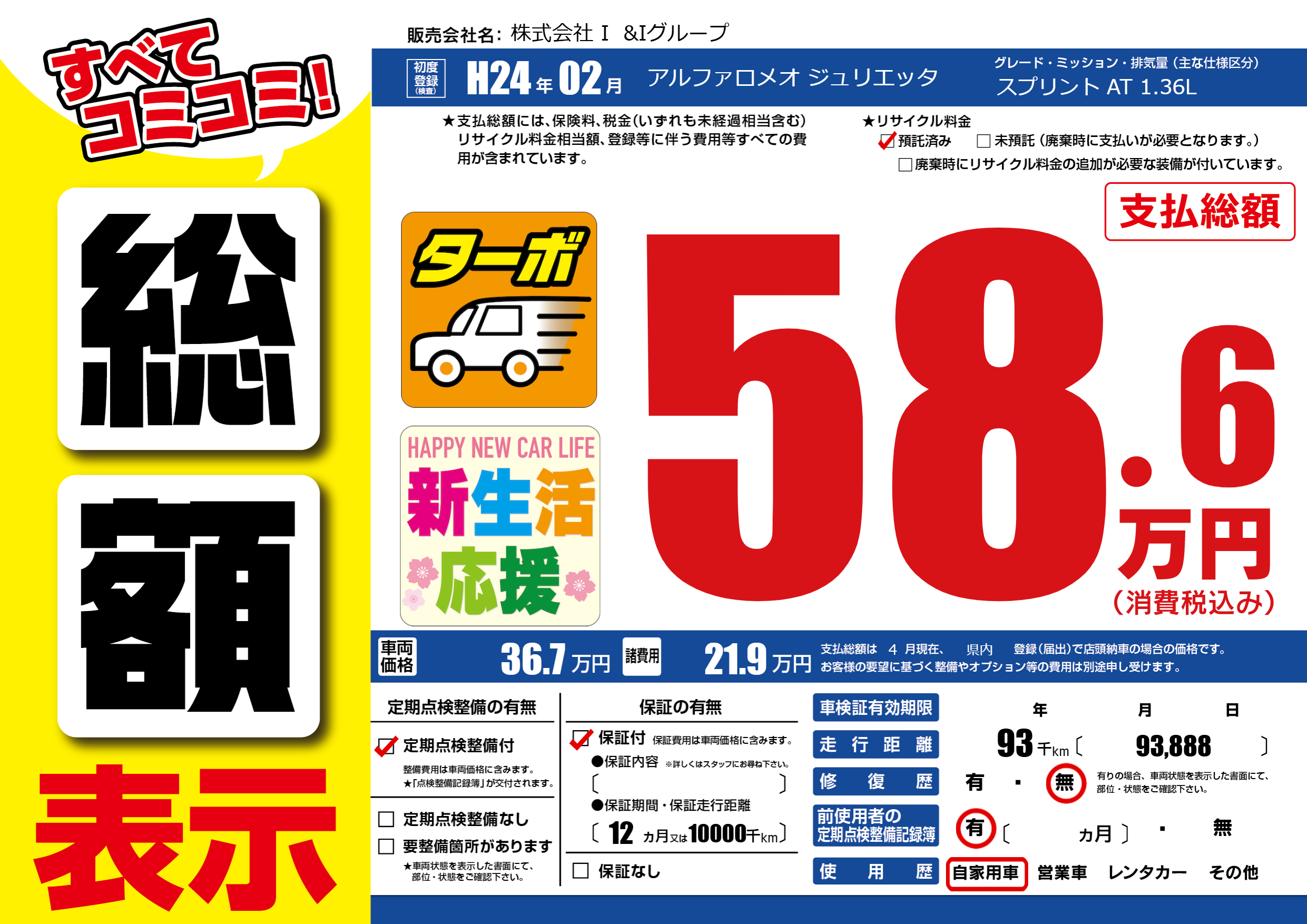 | 車名 | アルファロメオ ジュリエッタ | グレード ミッション 排気量 |