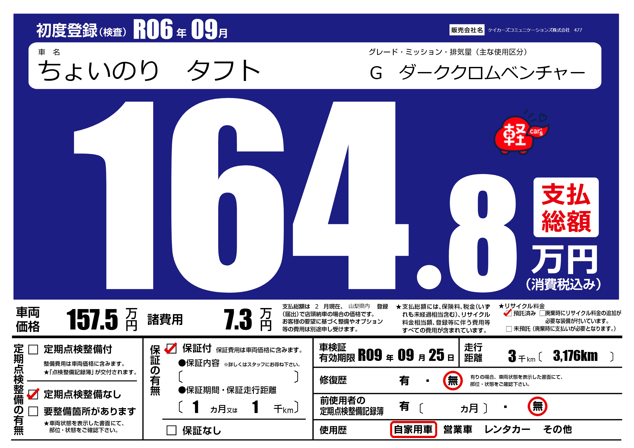 | 走行キロ | 0.3万km | 初年度登録 | R06年09月 |