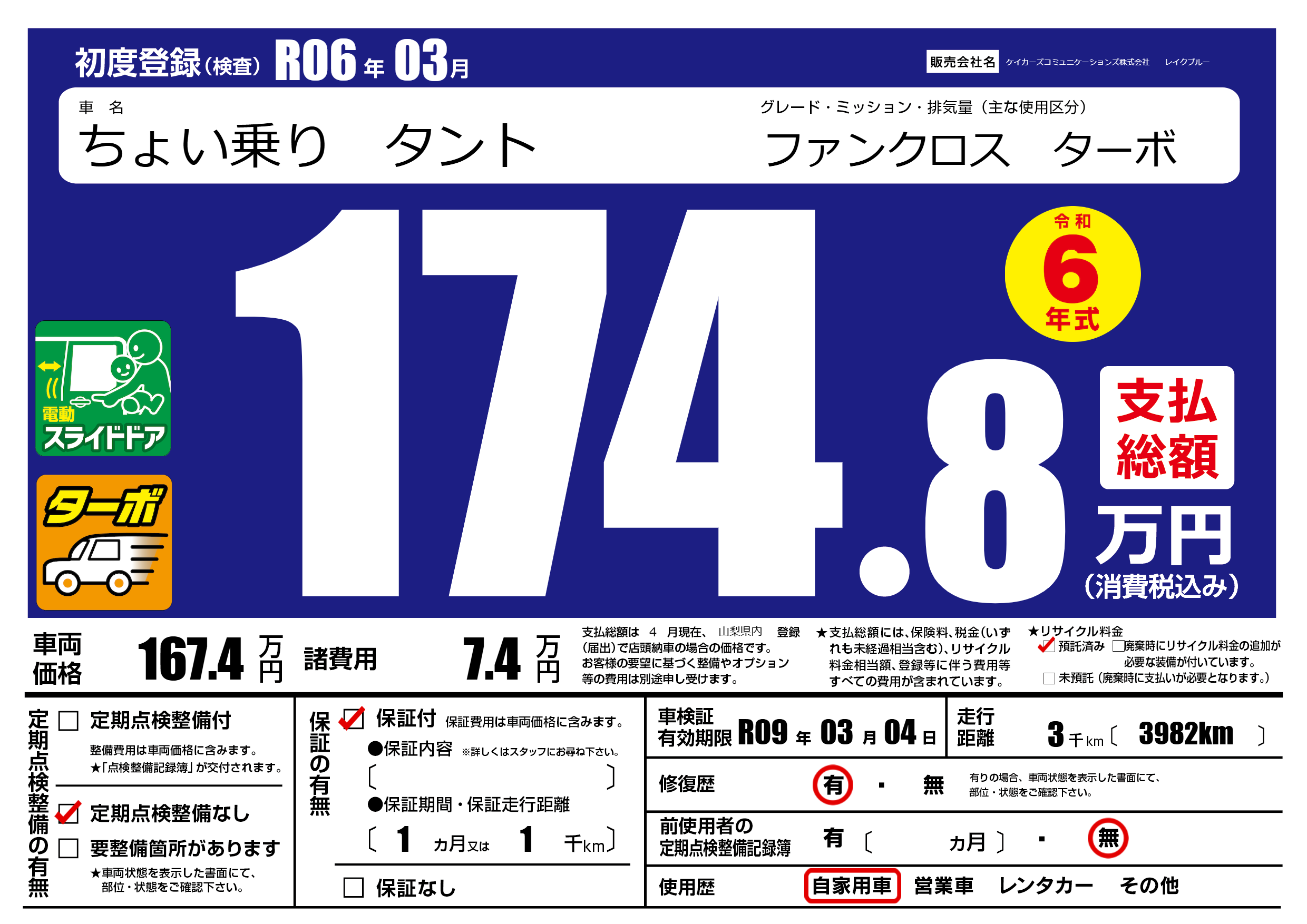 | 車名 | ちょい乗り タント | グレード ミッション 排気量 |