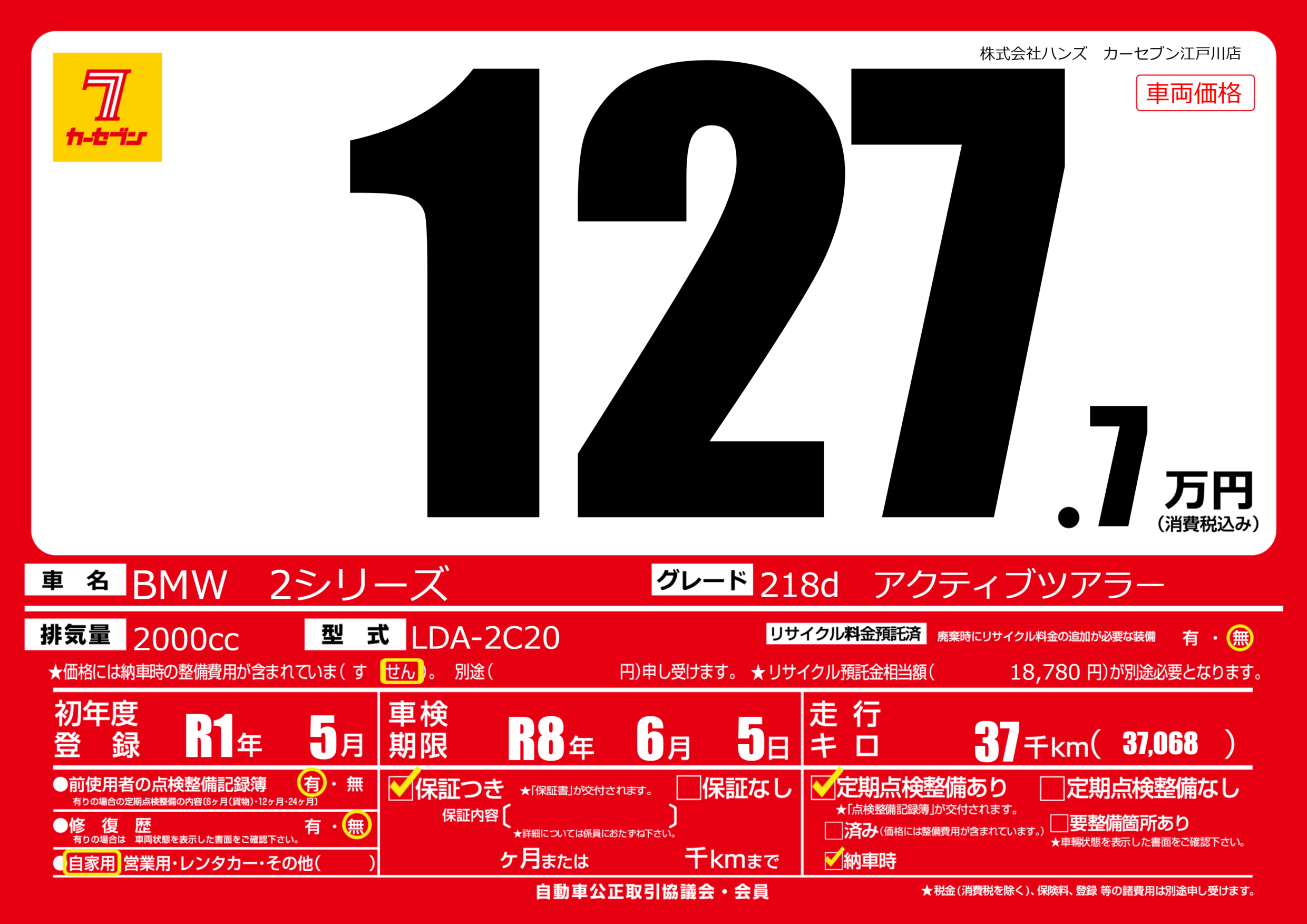 | 車名 | BMW 2シリーズ | グレード ミッション 排気量 |