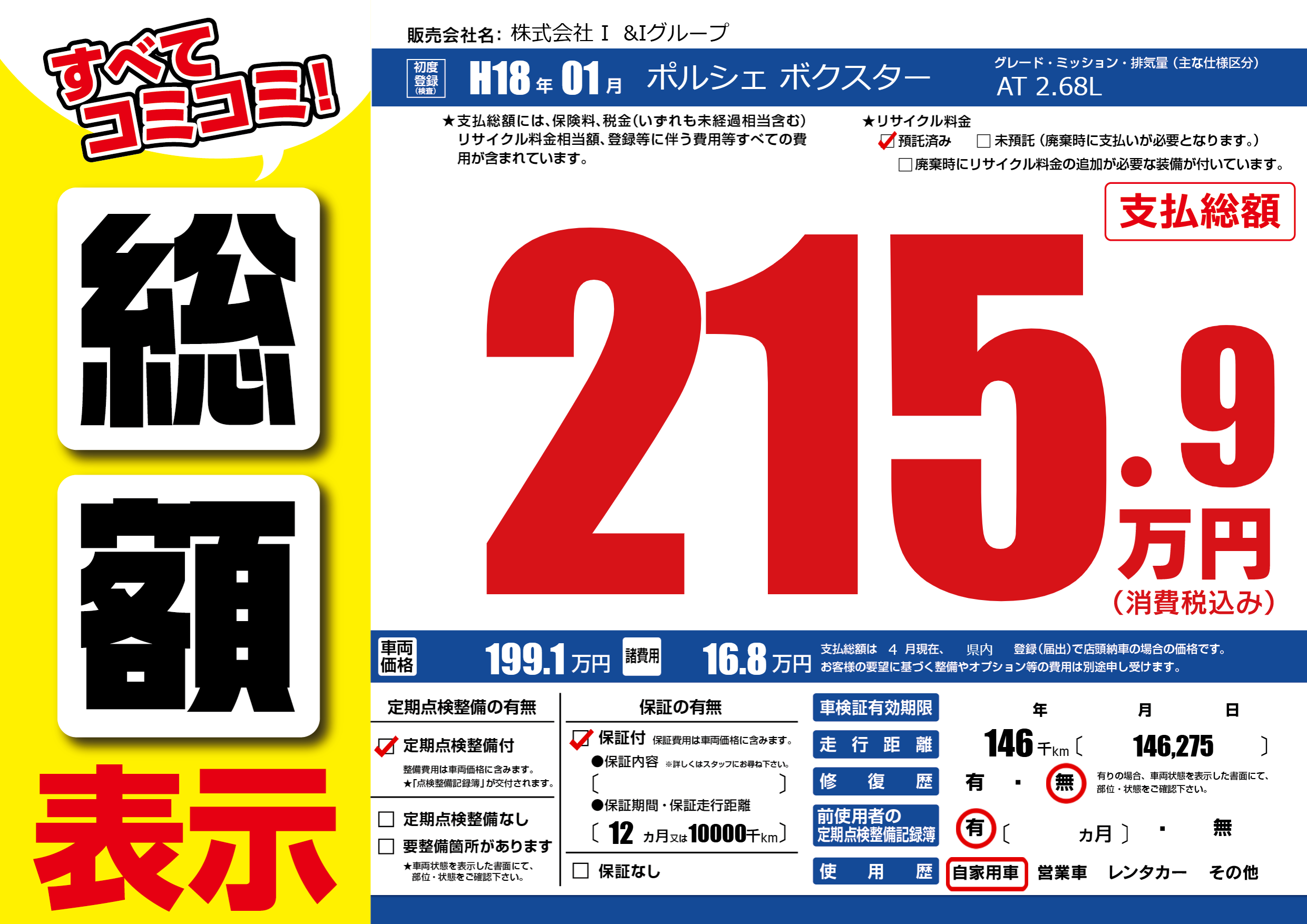 | 車名 | ポルシェ ボクスター | グレード ミッション 排気量 |