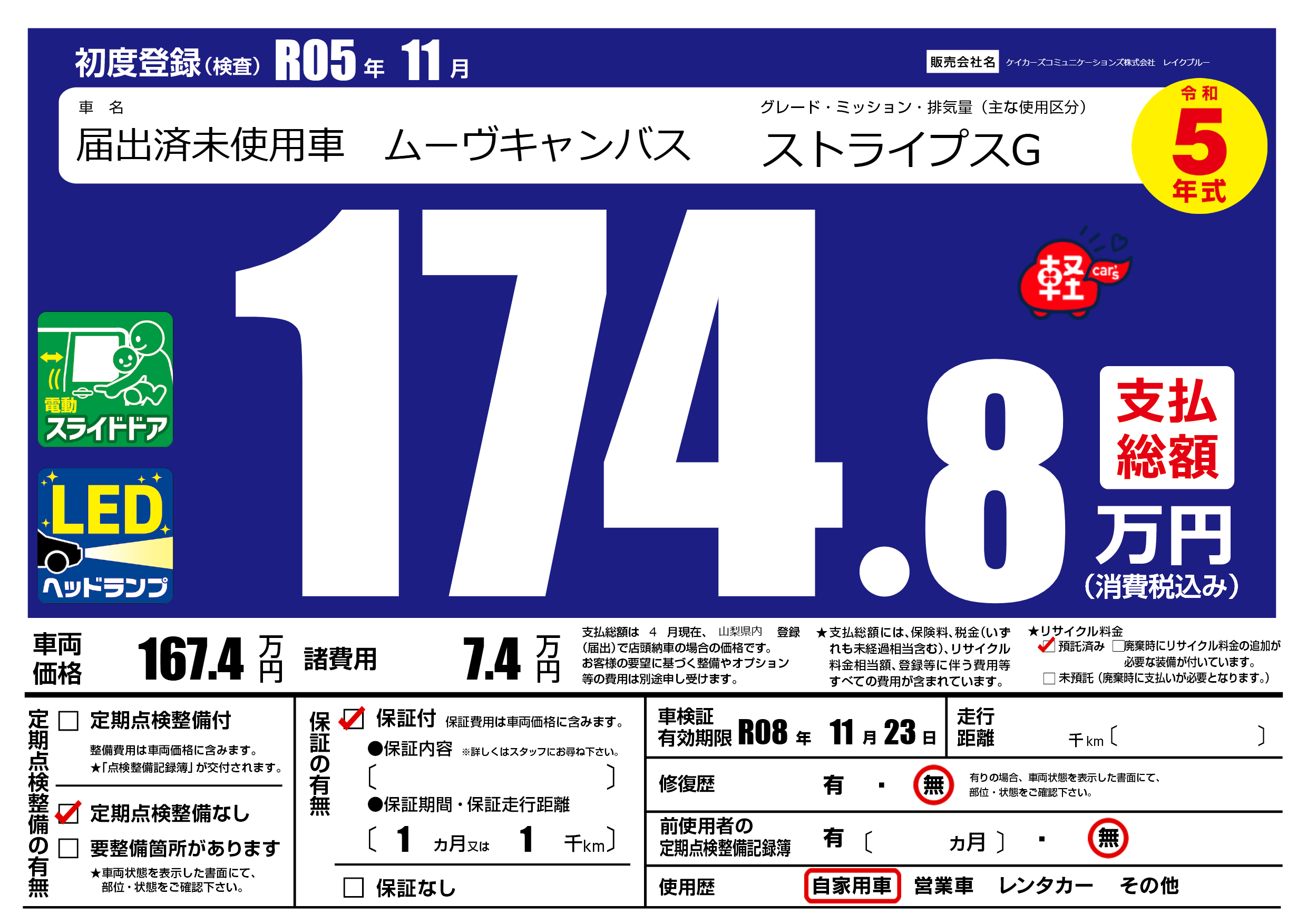 | 走行キロ | - | 初年度登録 | R05年11月 |