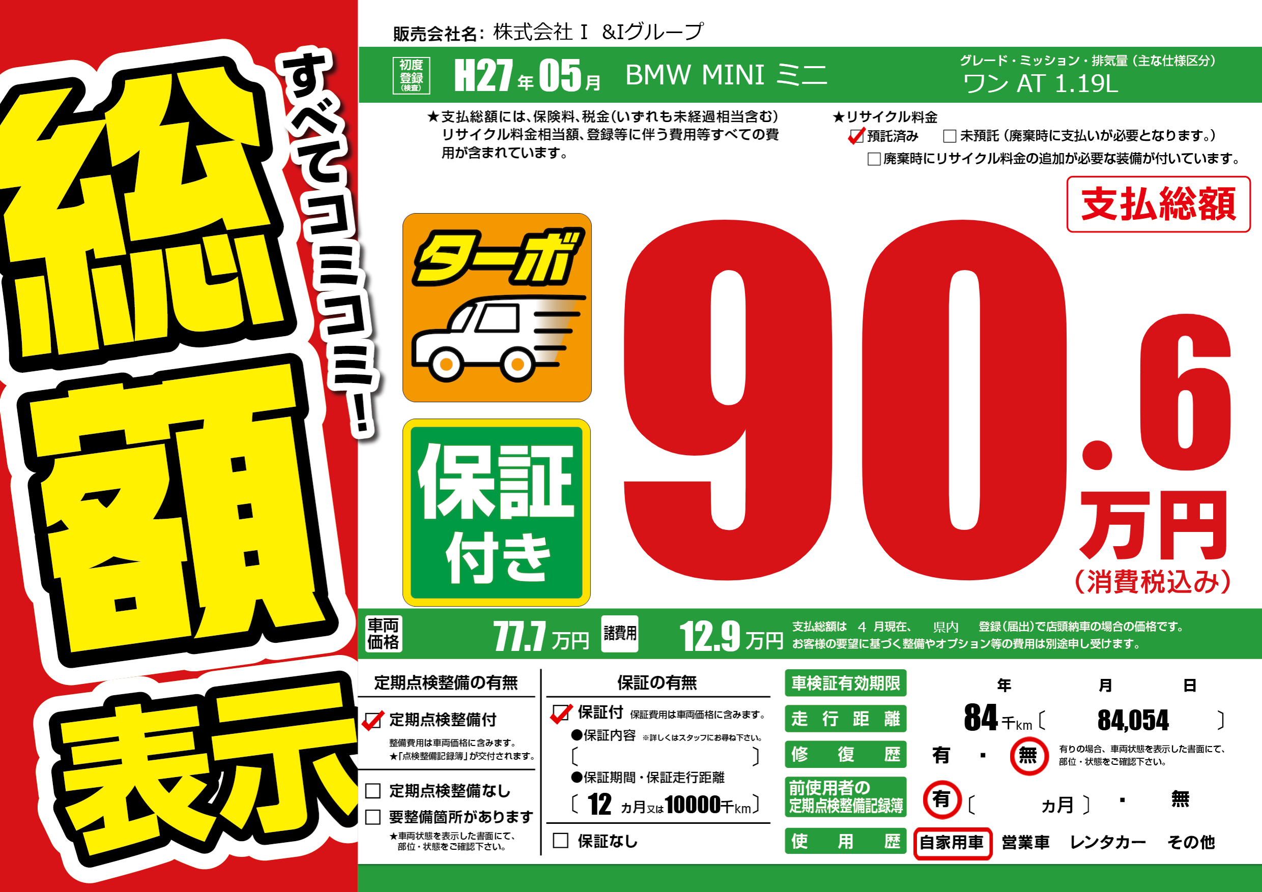 | 車名 | BMW MINI ミニ | グレード ミッション 排気量 |