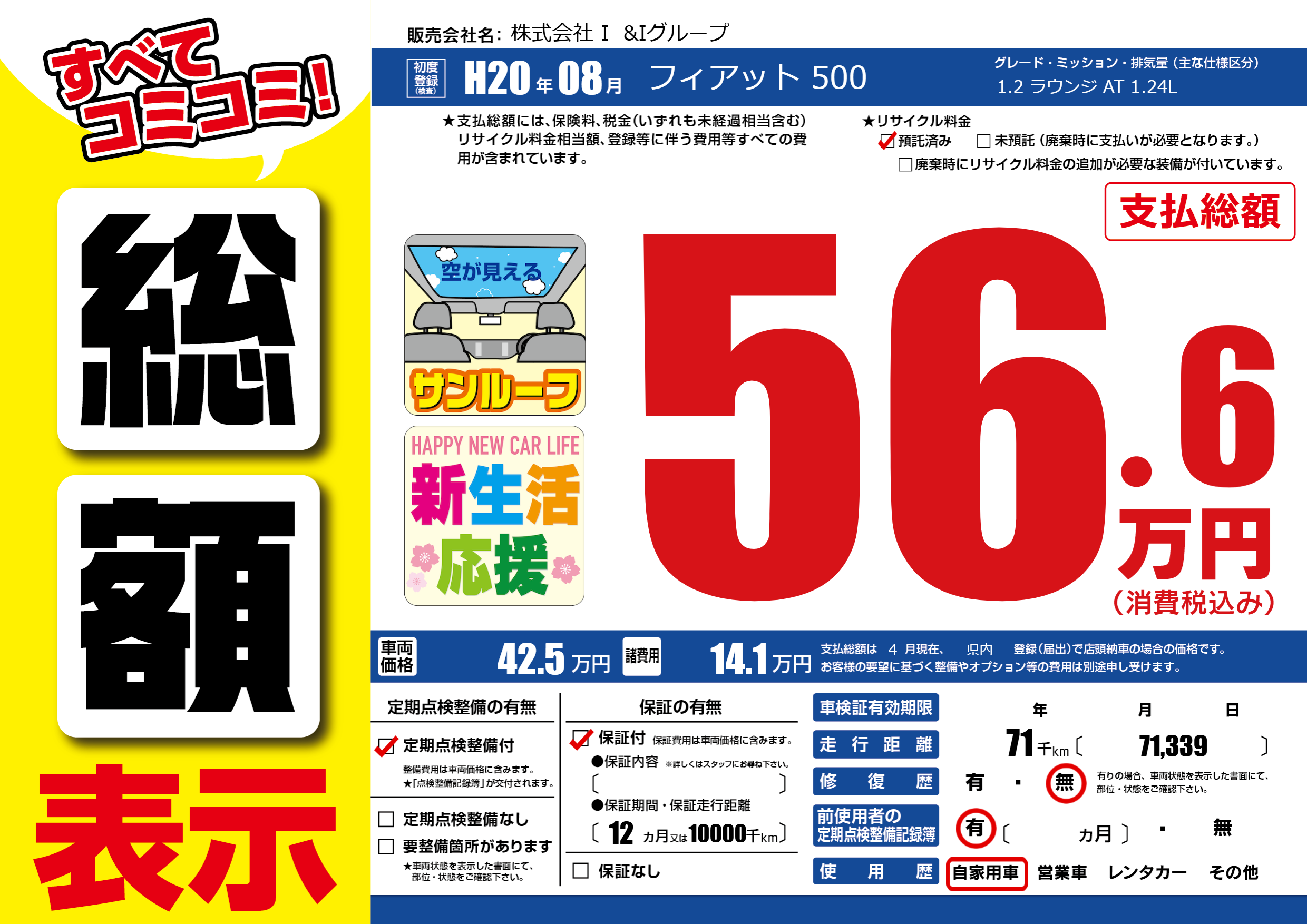 | 車名 | フィアット 500 | グレード ミッション 排気量 |