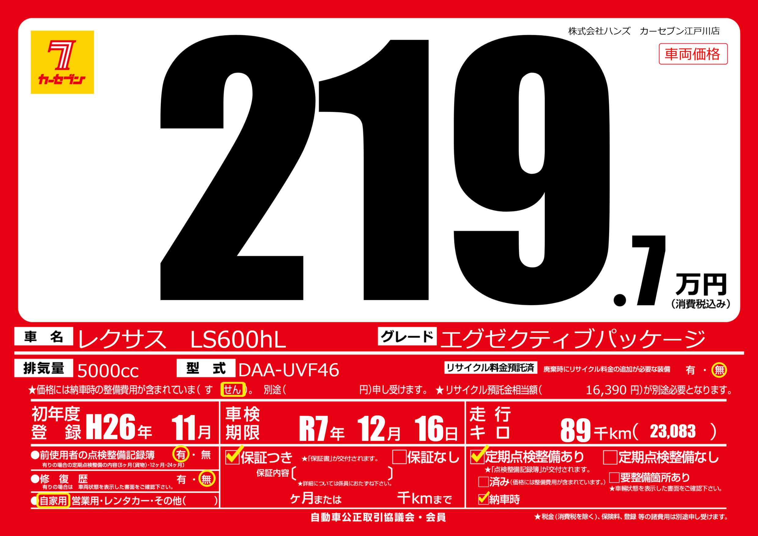 | 車名 | レクサス LS600hL | グレード ミッション 排気量 |