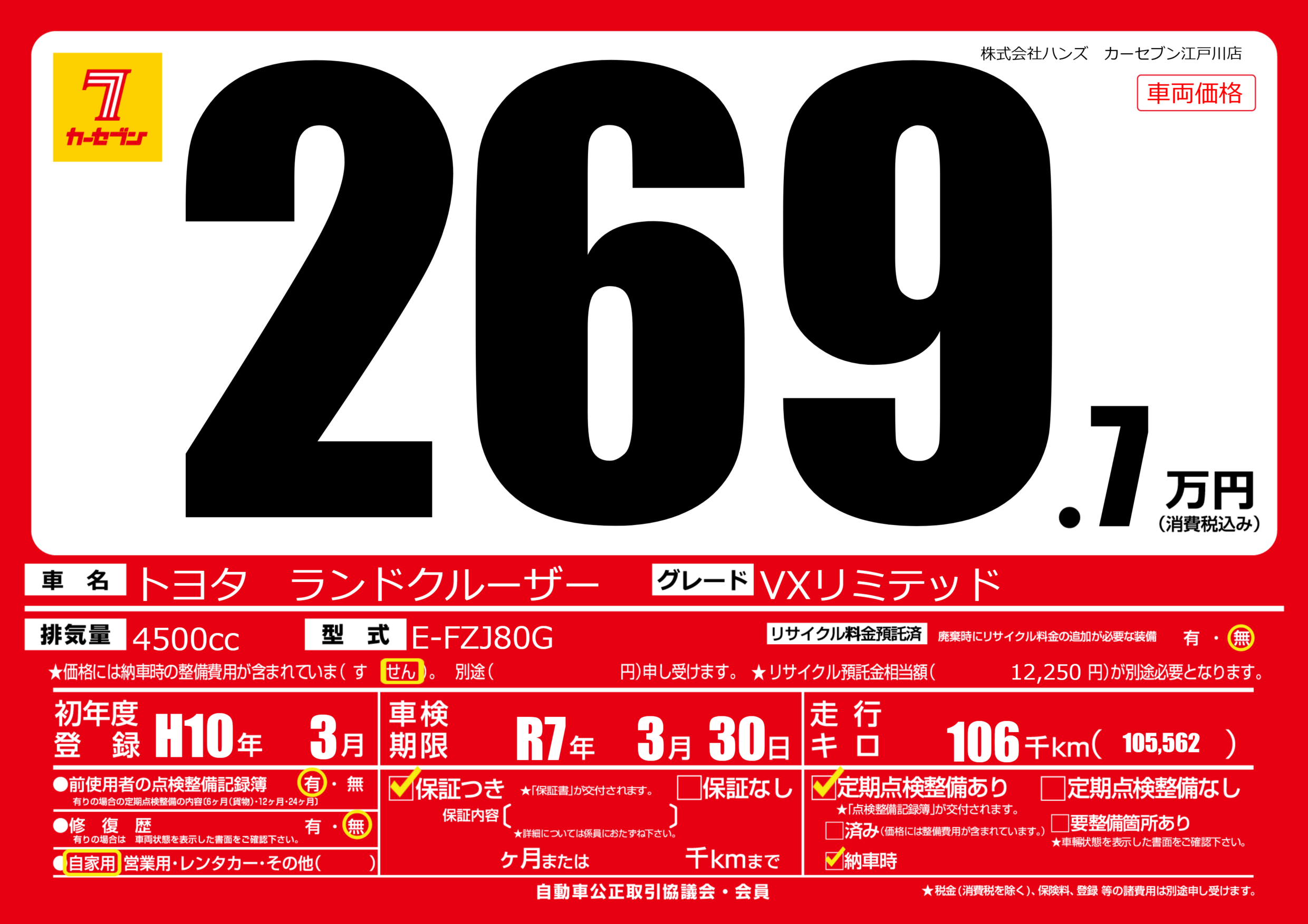 | 走行キロ | 10.6万km | 初年度登録 | H10年3月 |