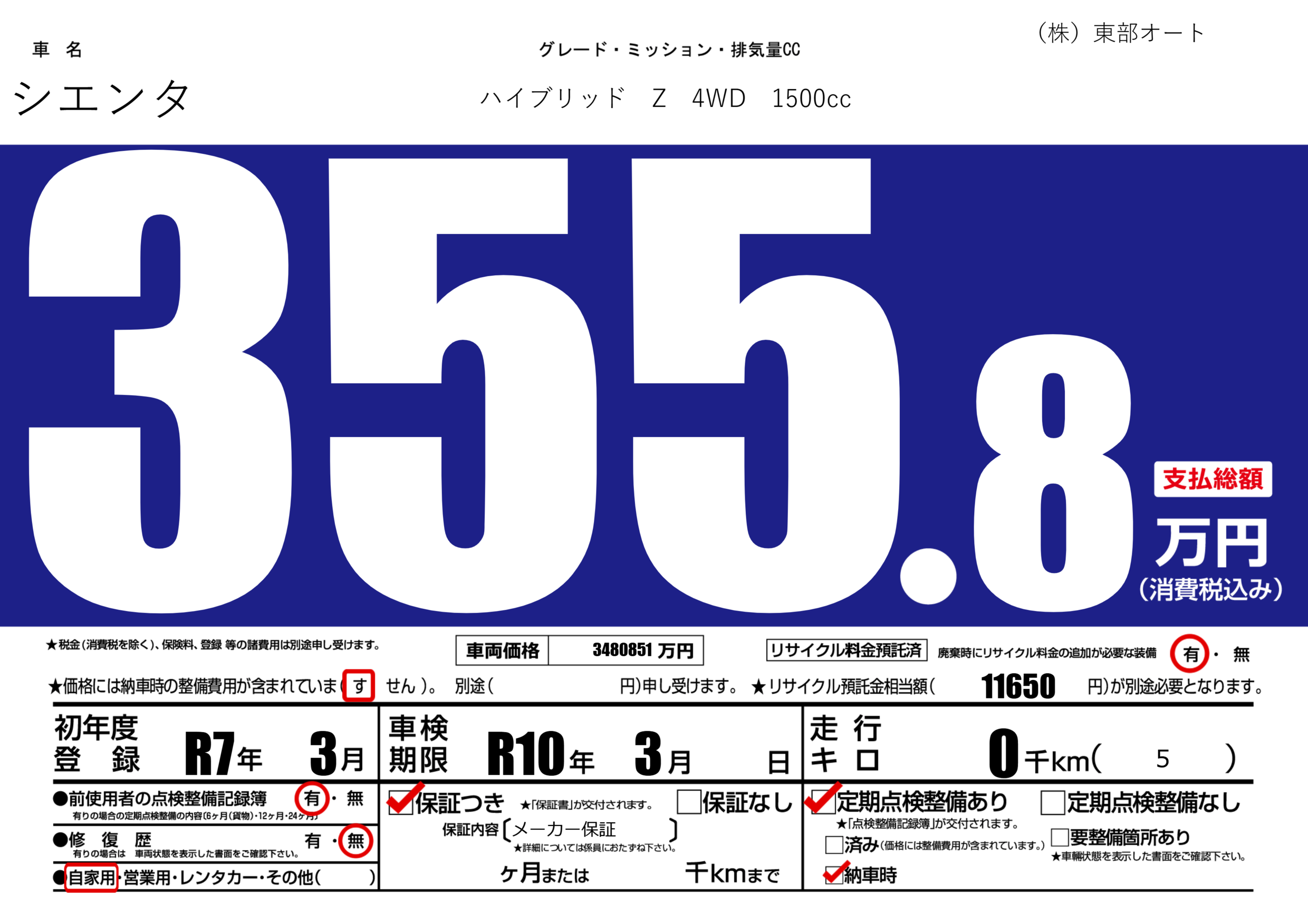 | 車名 | シエンタ | グレード ミッション 排気量 |