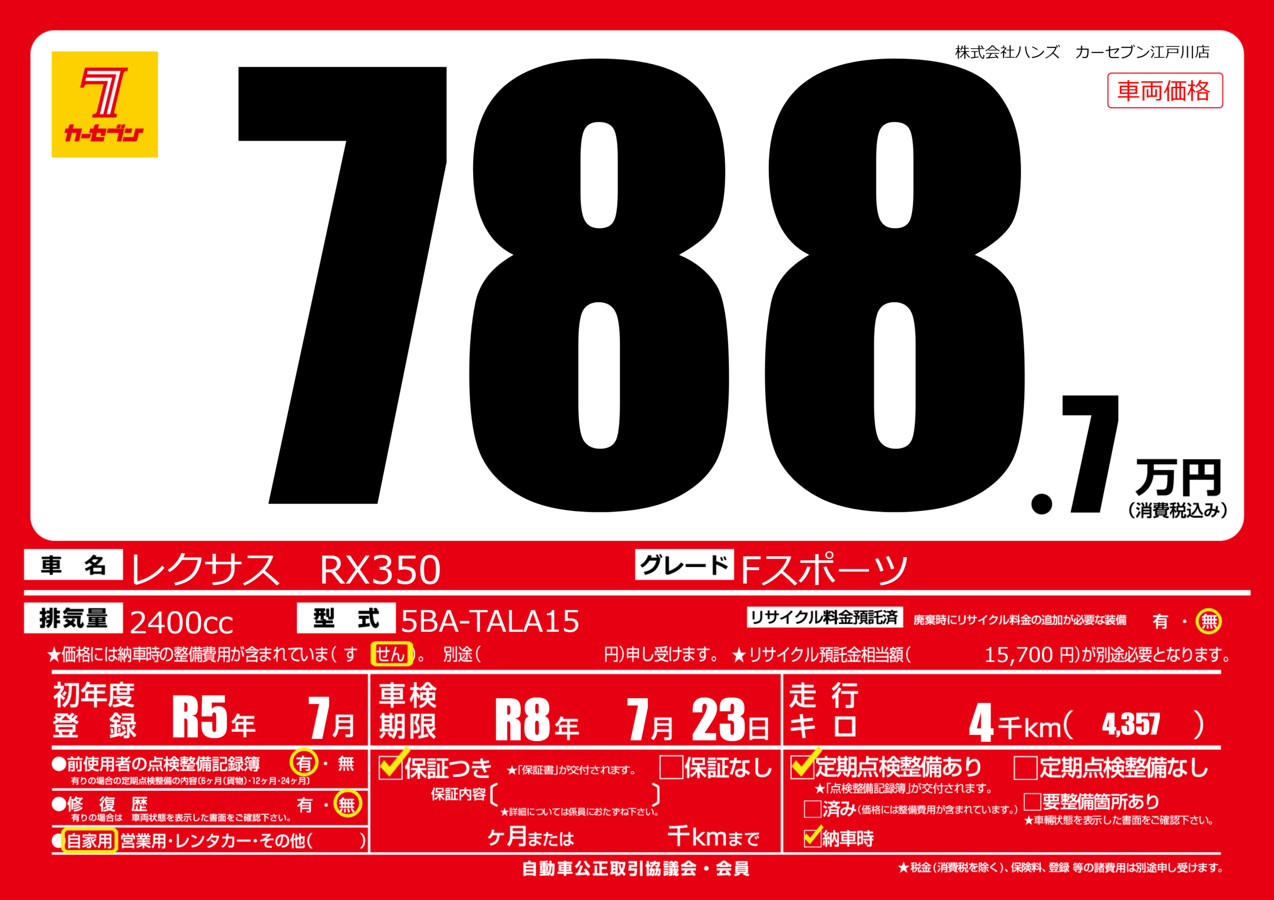 | 車名 | レクサス RX350 | グレード ミッション 排気量 |