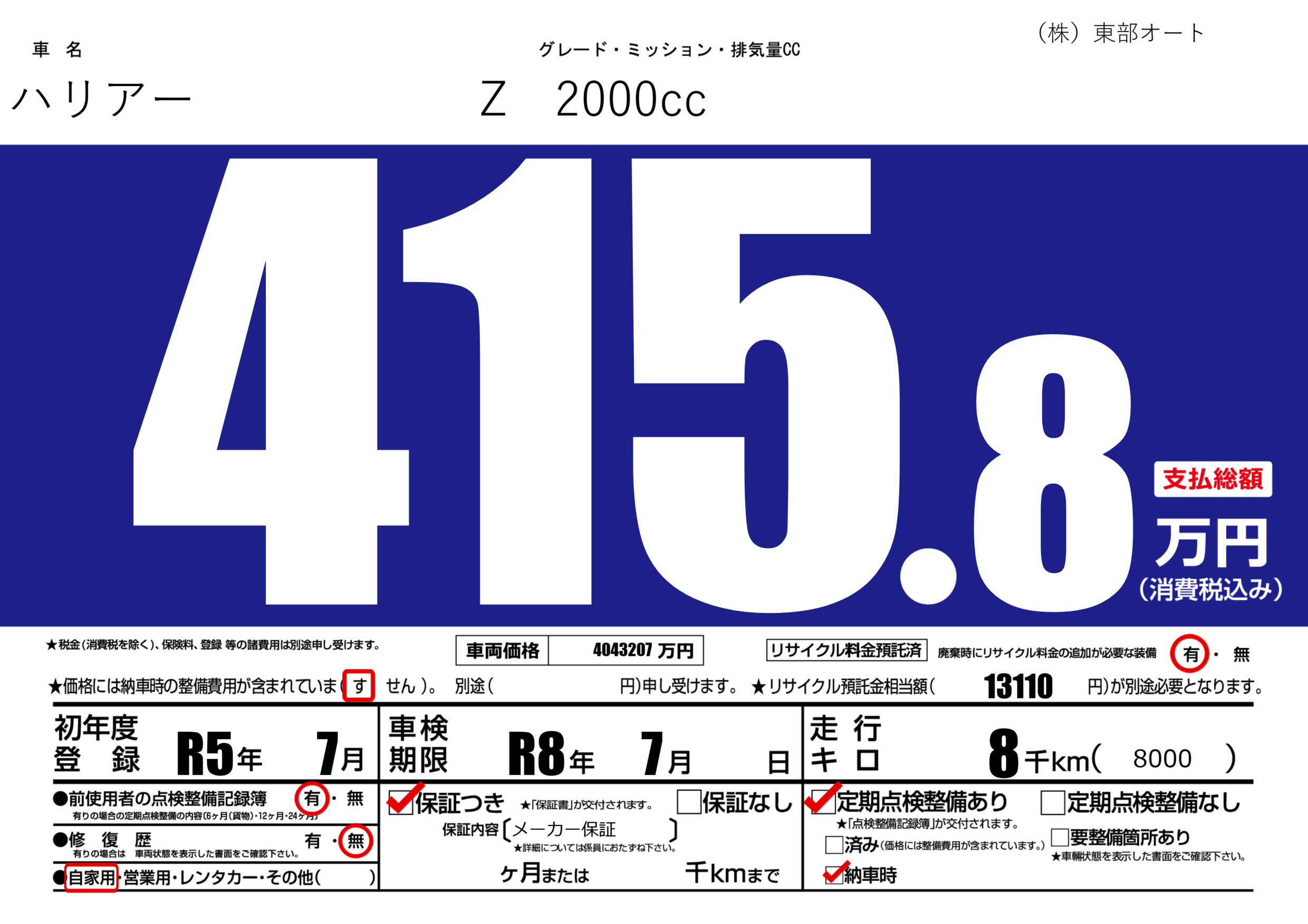 | 走行キロ | 0.8万km | 初年度登録 | R5年7月 |