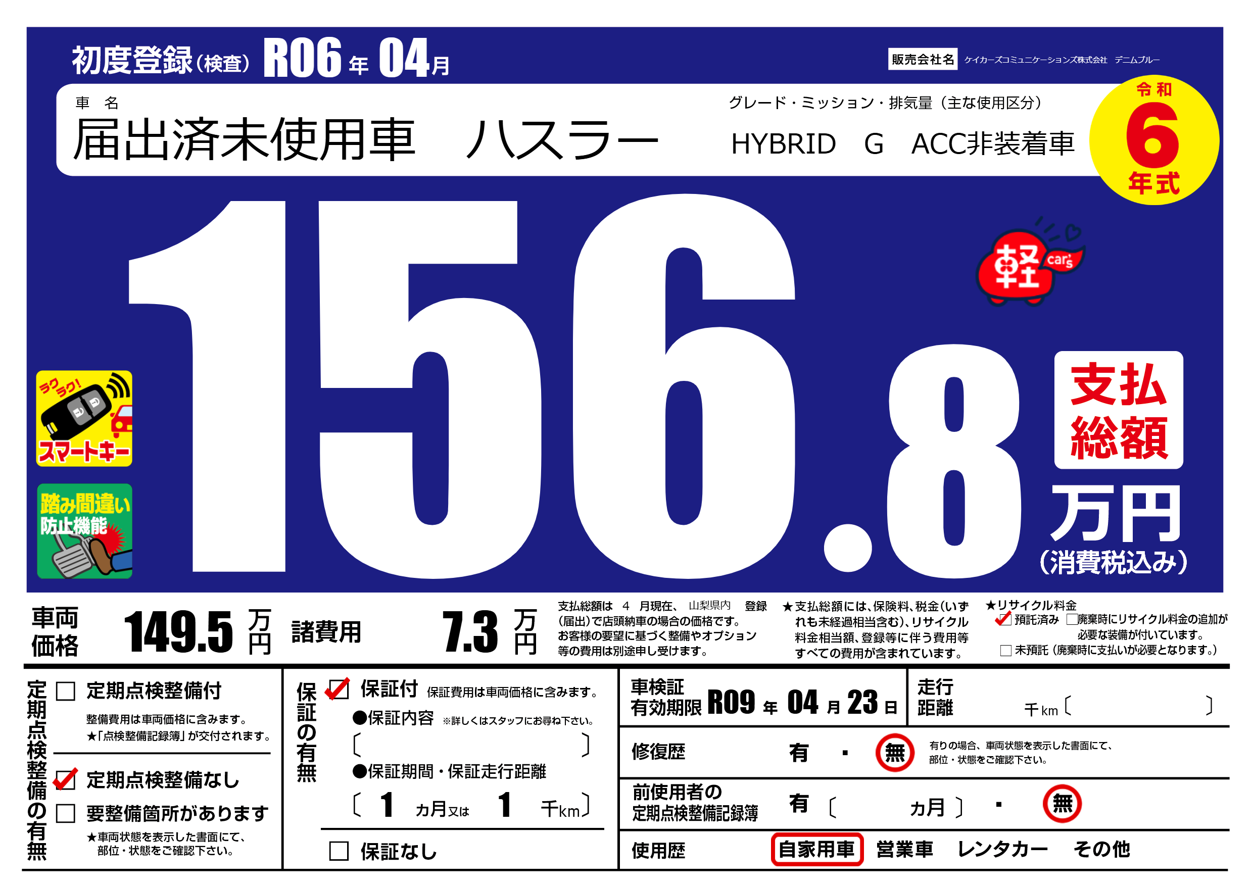 | 車名 | 届出済未使用車 ハスラー | グレード ミッション 排気量 |