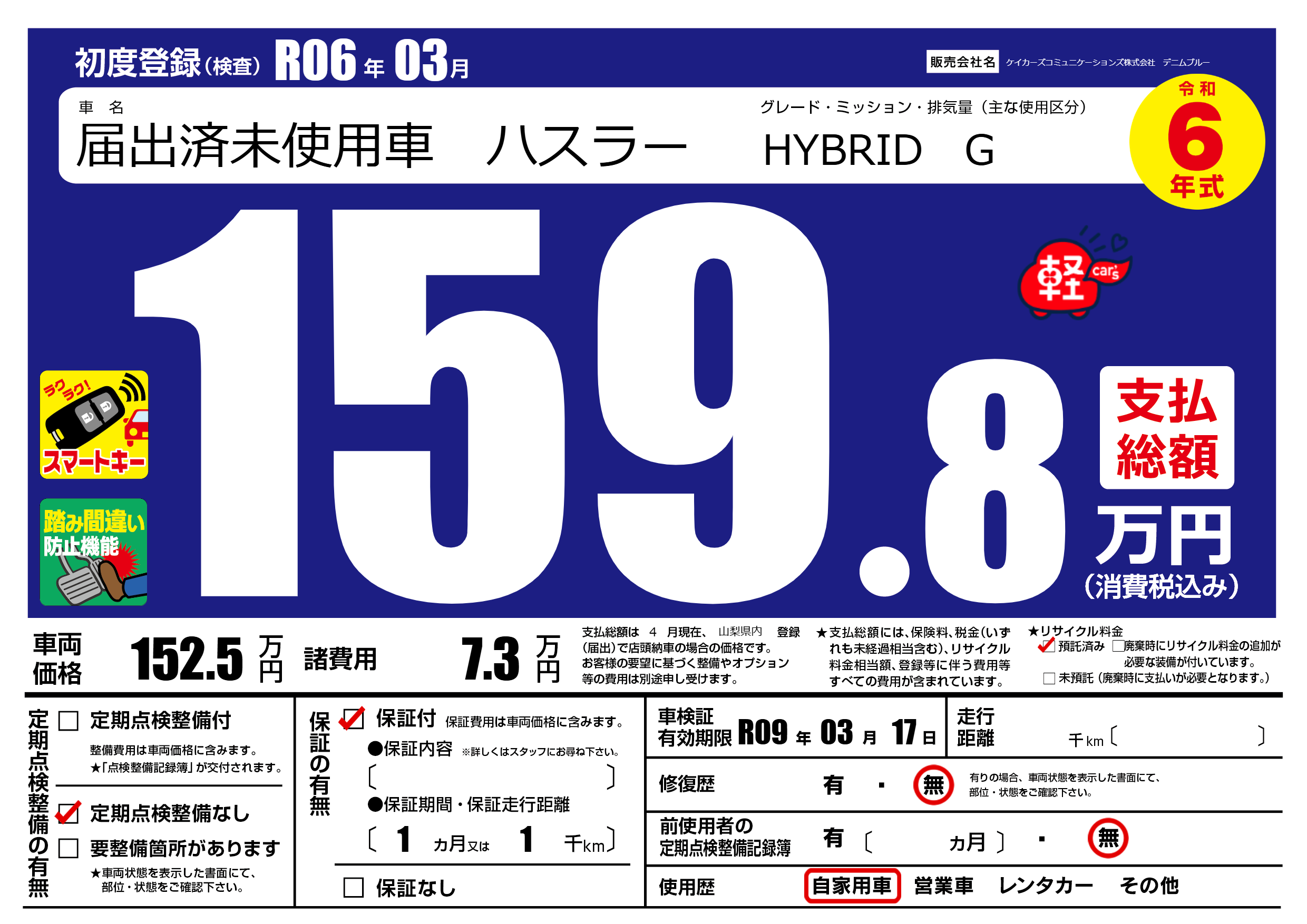 | 走行キロ | - | 初年度登録 | R06年03月 |