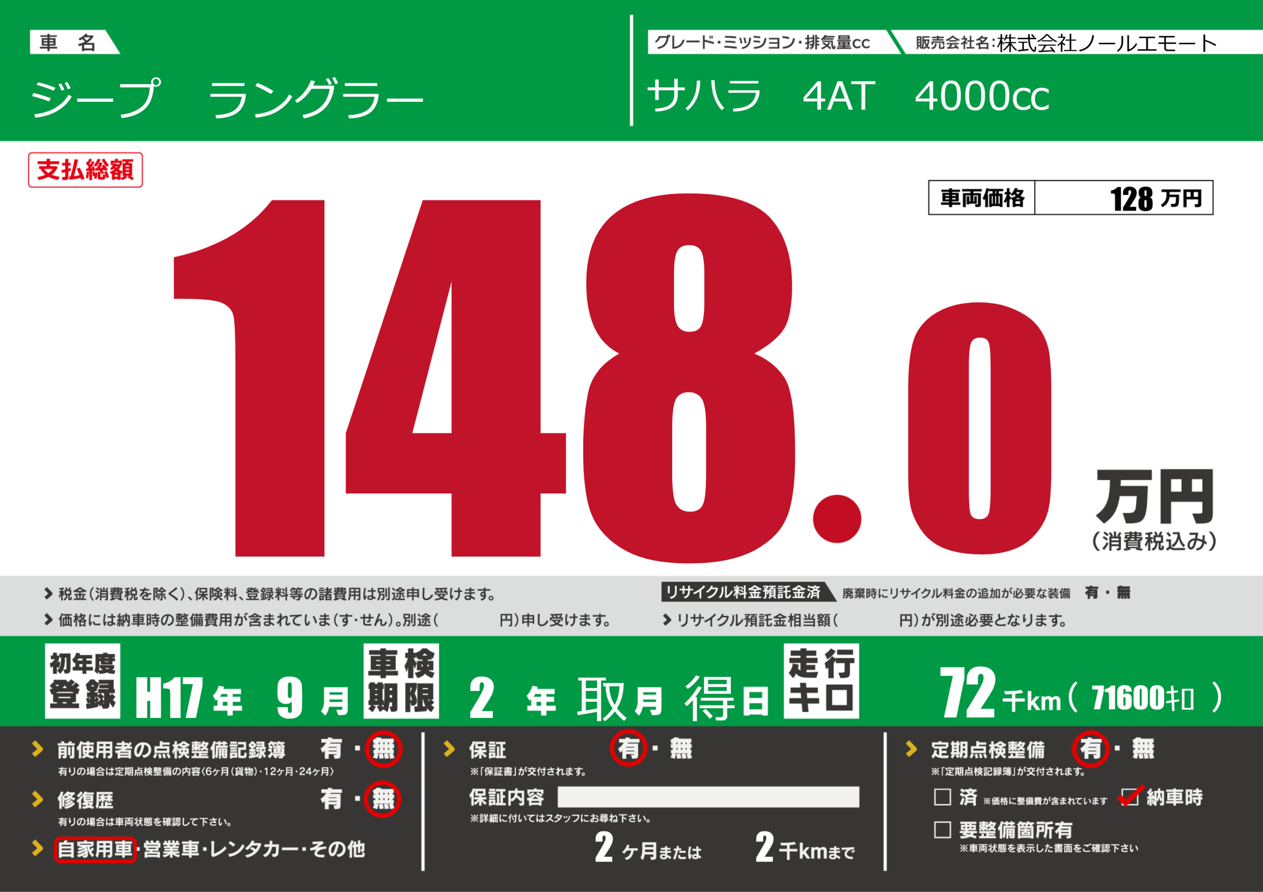 | 走行キロ | 7.2万km | 初年度登録 | H17年9月 |