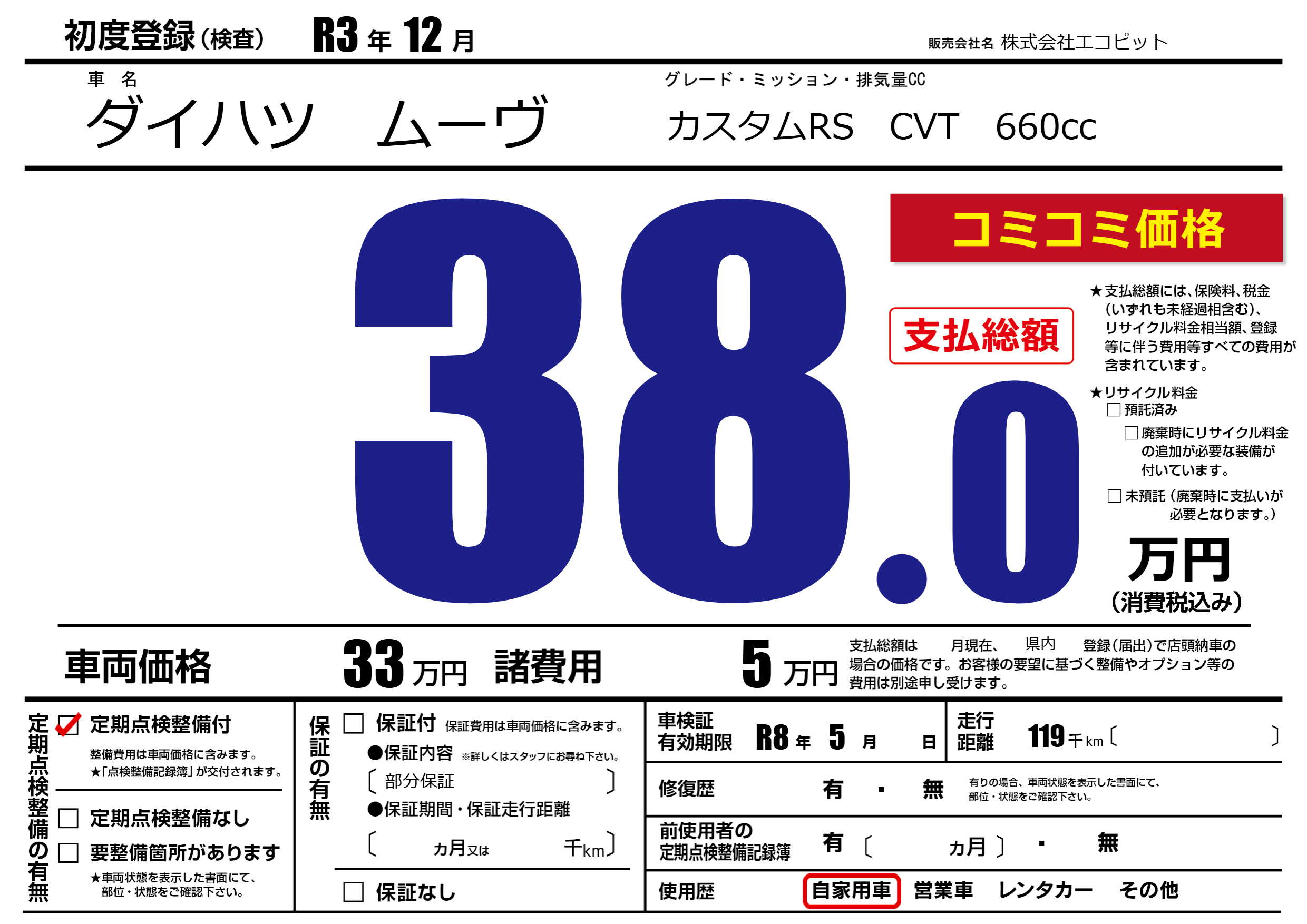 | 車名 | ダイハツ ムーヴ | グレード ミッション 排気量 |