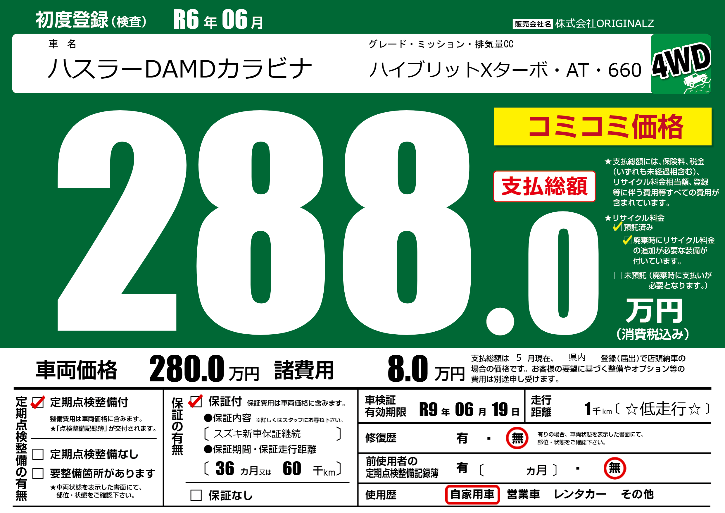 | 車名 | ハスラーDAMDカラビナ | グレード ミッション 排気量 |