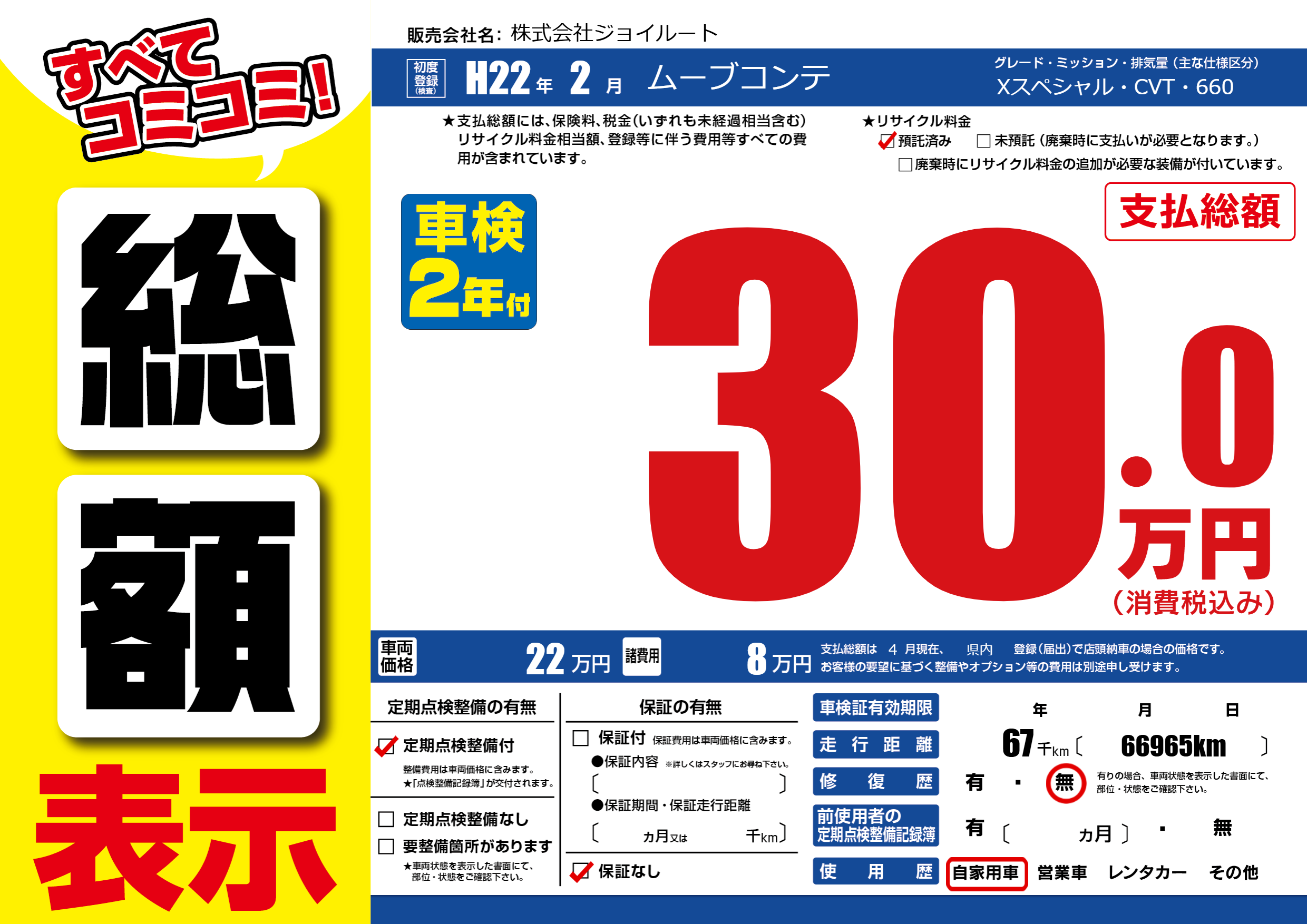 | 走行キロ | 6.7万km | 初年度登録 | H22年2月 |