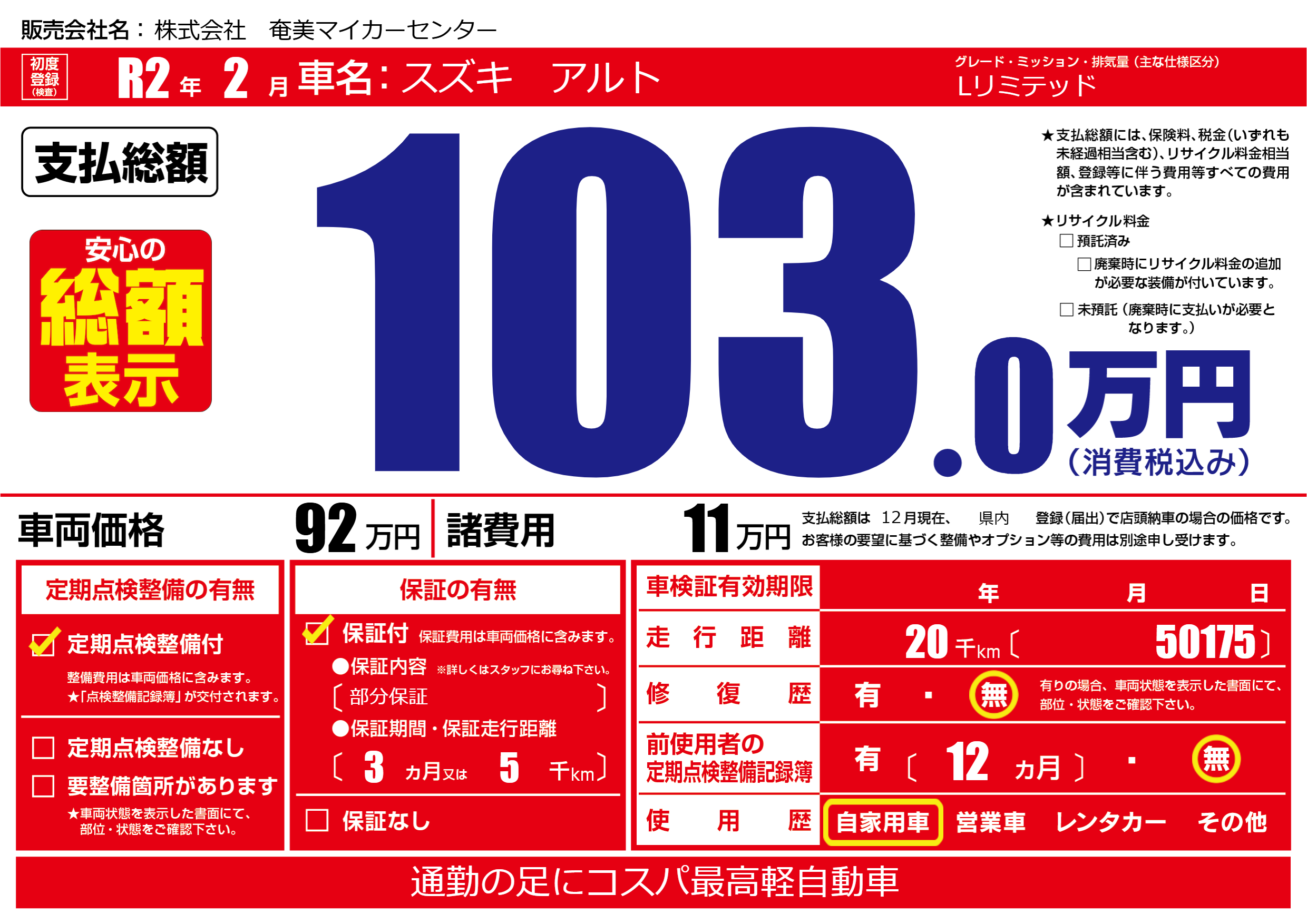 | 車名 | スズキ アルト | グレード ミッション 排気量 |