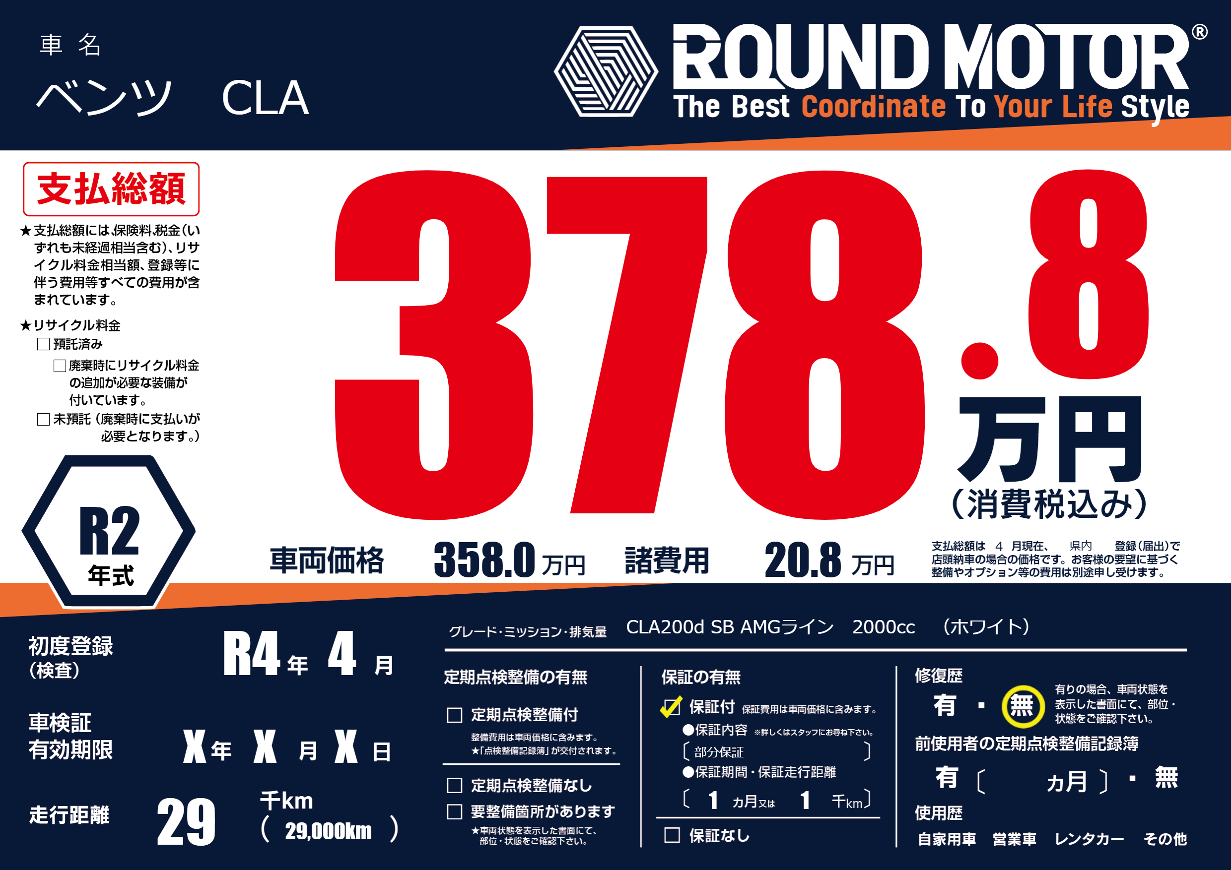 | 車名 | ベンツ CLA | グレード ミッション 排気量 |