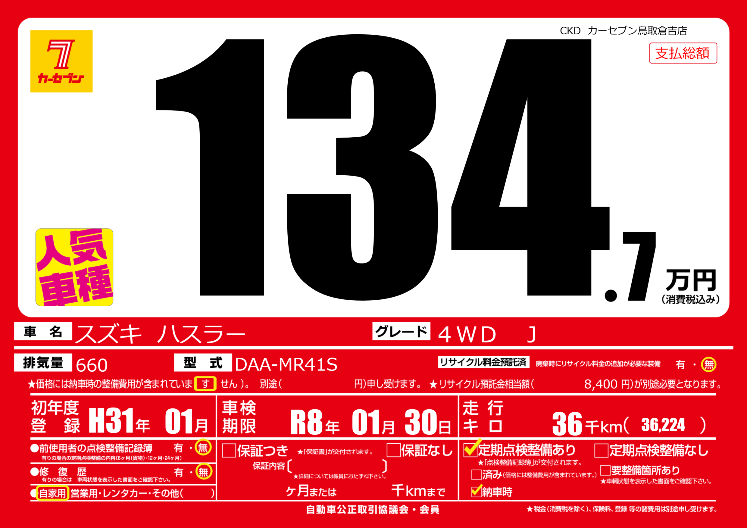 | 車名 | スズキ ハスラー | グレード ミッション 排気量 |
