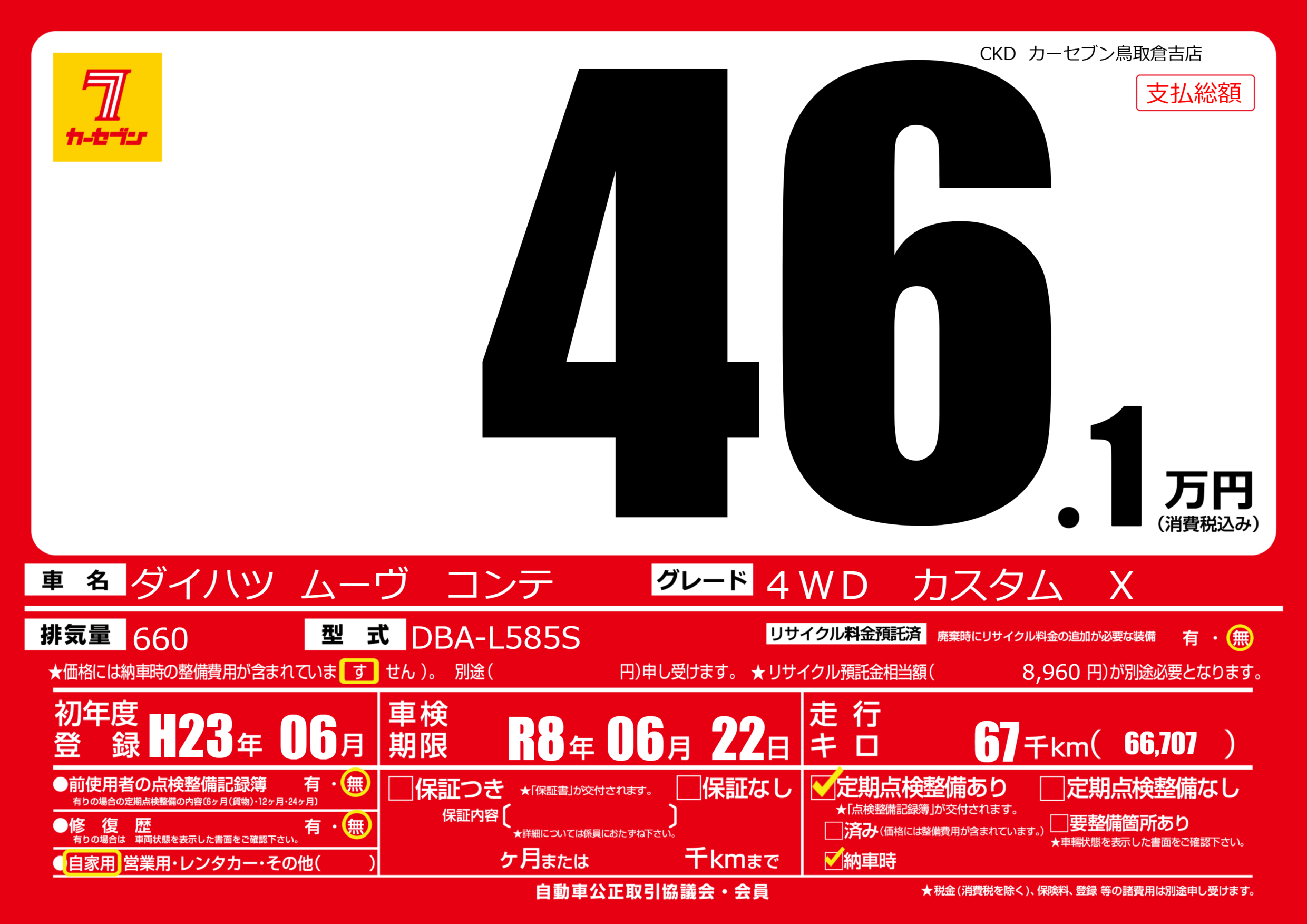 | 走行キロ | 6.7万km | 初年度登録 | H23年06月 |