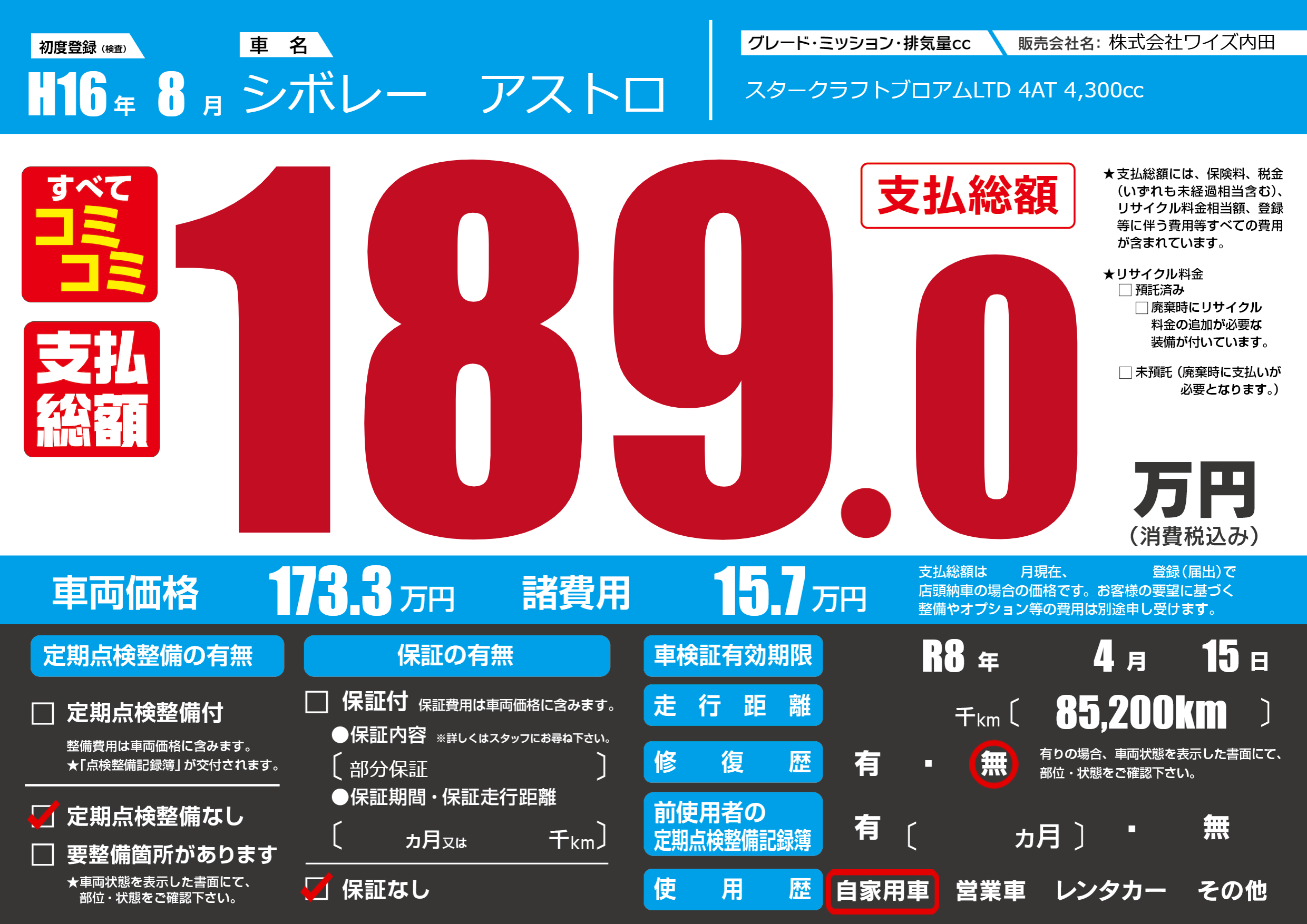 なし | 車検制限 | R8年4月15月 |