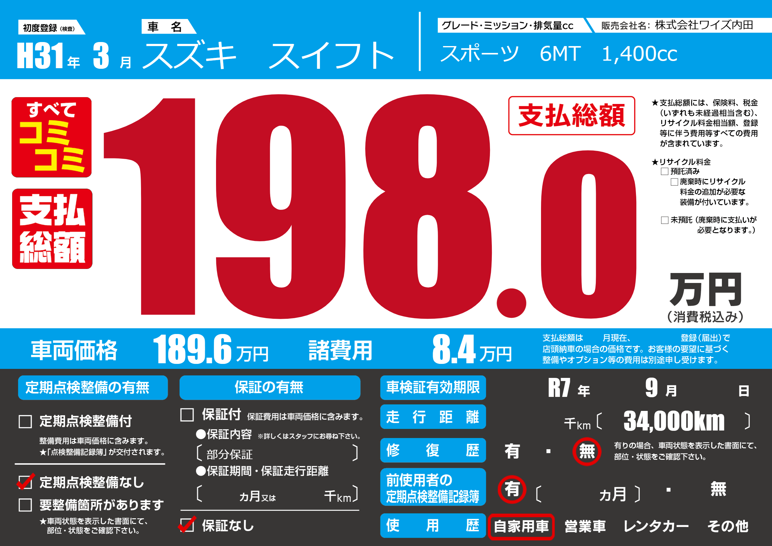 | 車名 | スズキ スイフト | グレード ミッション 排気量 |
