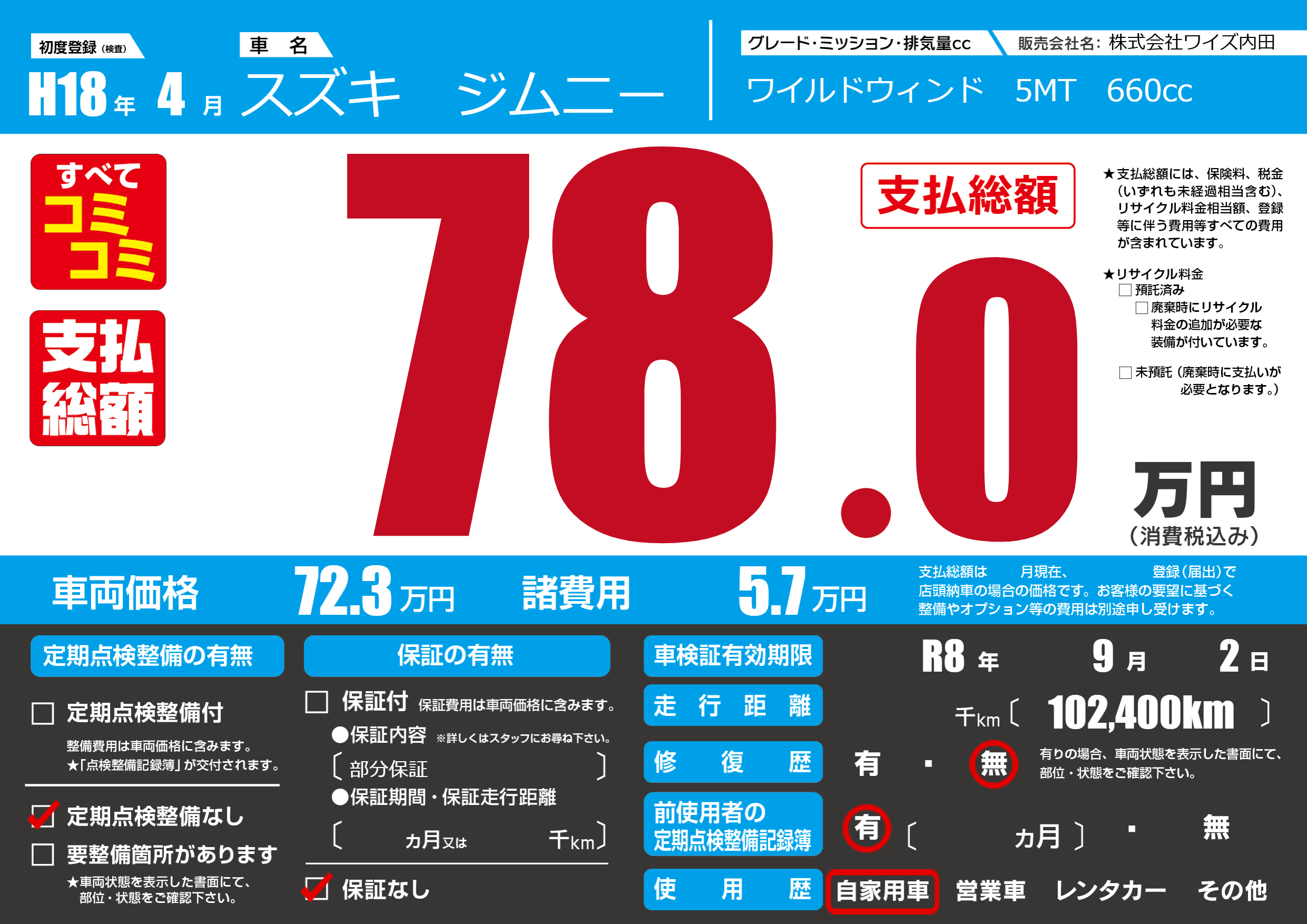 | 車検制限 | R8年 9月 2日 | ||