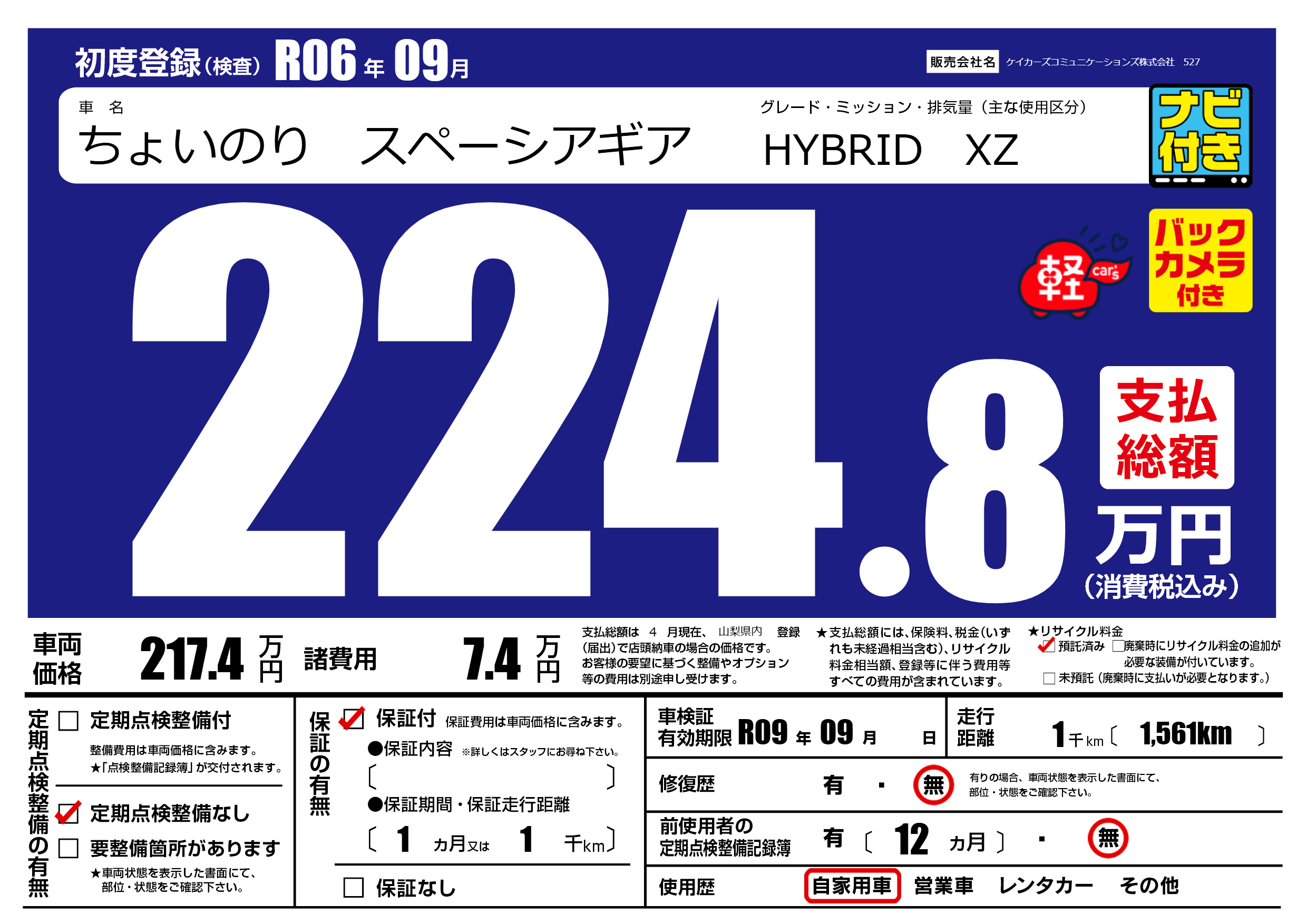 | 車検制限 | R09年 09月 - 日 | ||