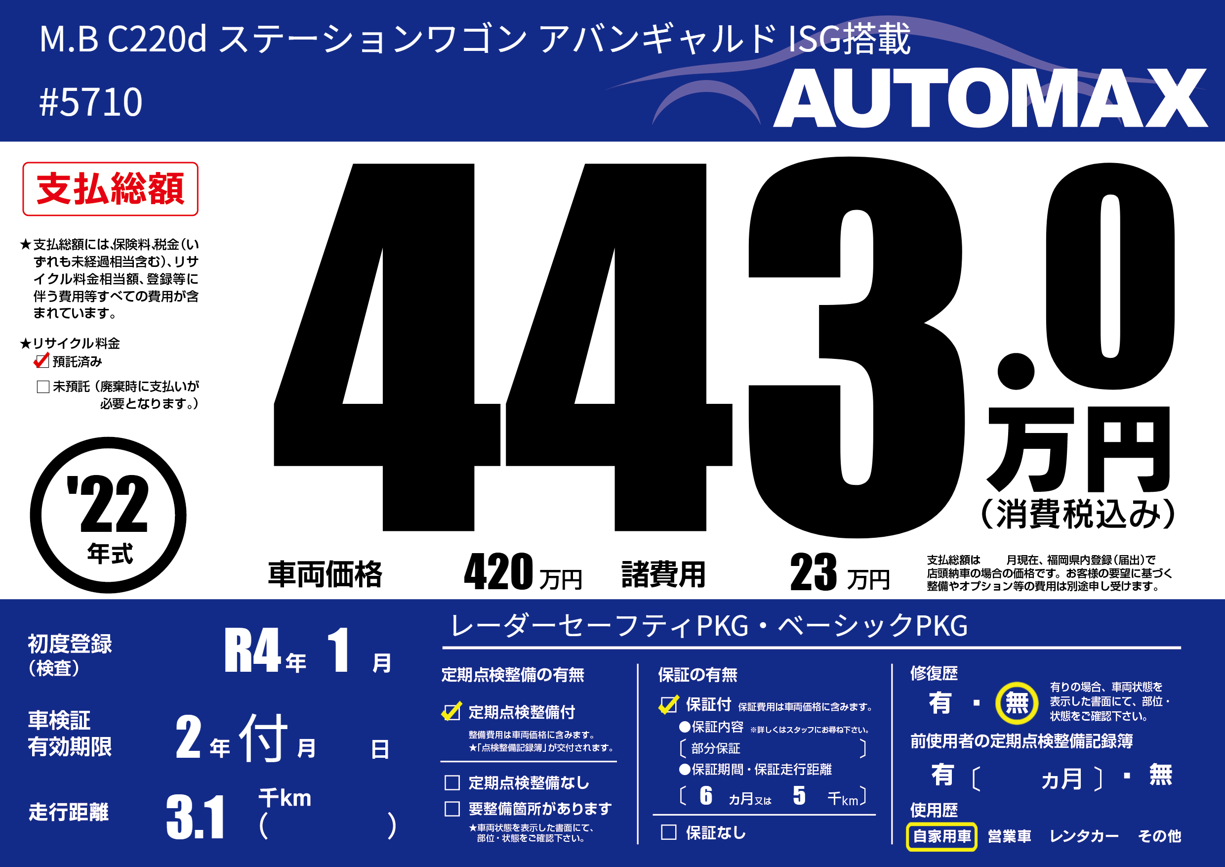 | 車名 | M.B C220d ステーションワゴン アバンギャルド ISG搭載 | グレード ミッション 排気量 |