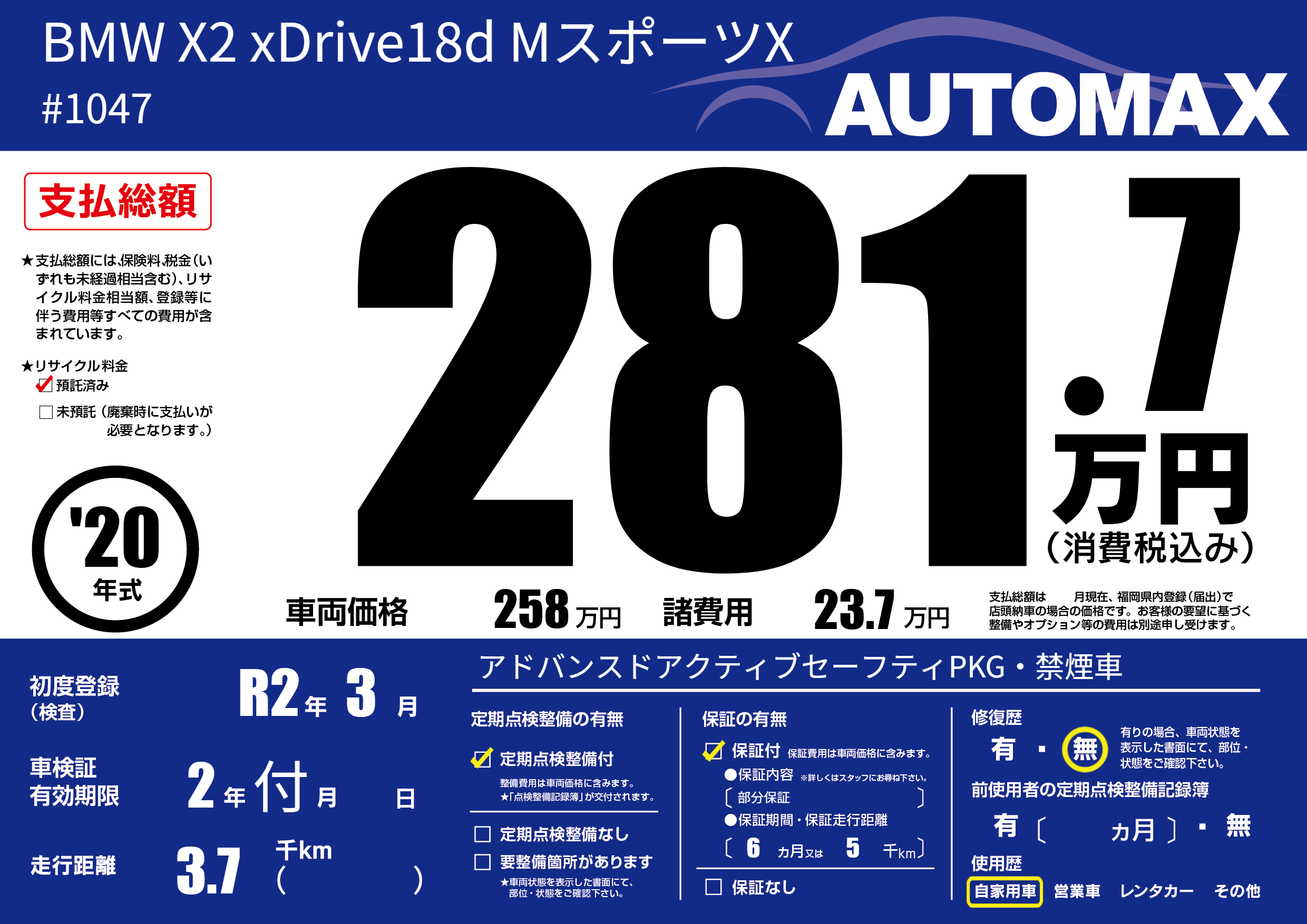 | 車名 | BMW X2 xDrive18d MスポーツX | グレード ミッション 排気量 |