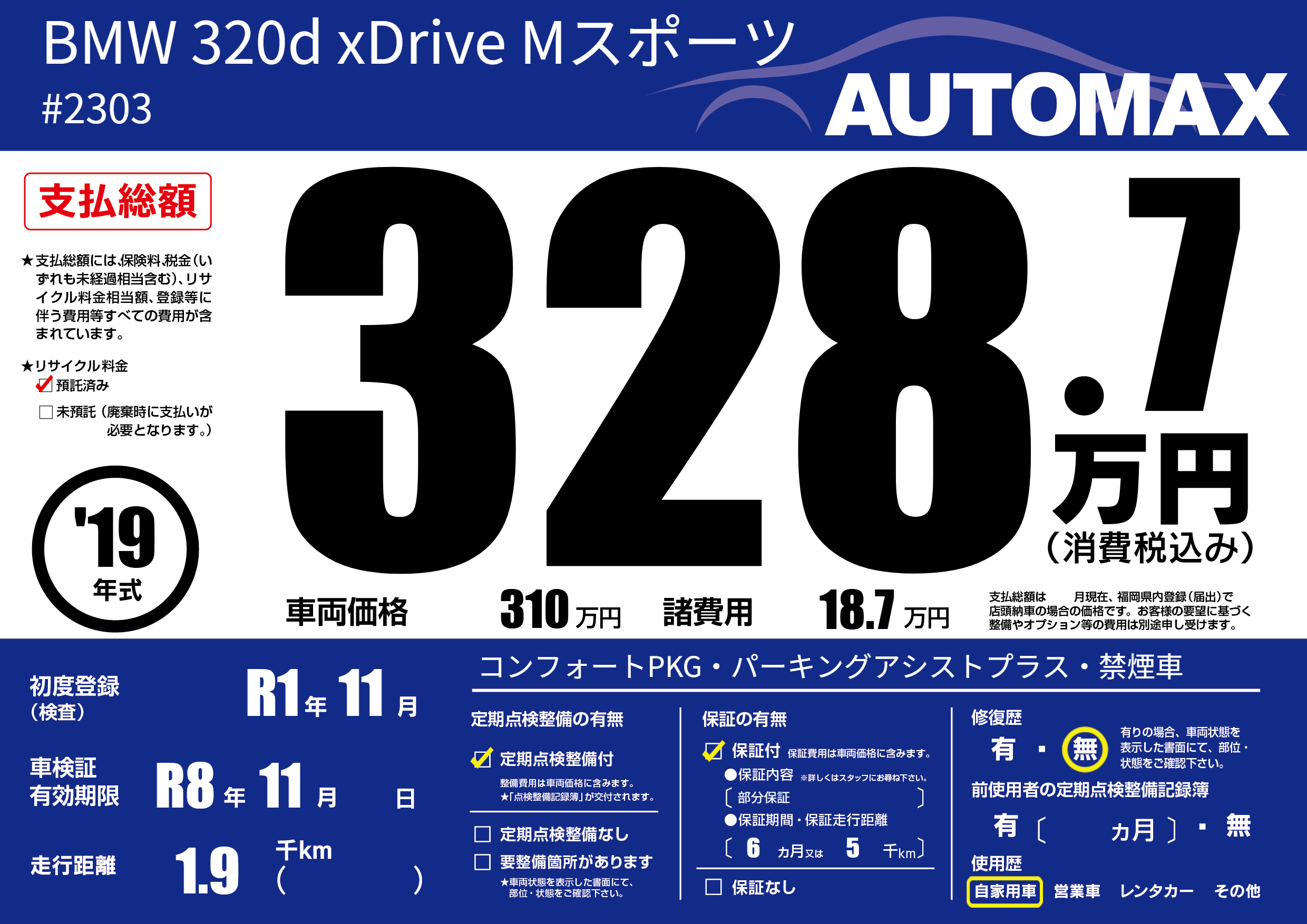 | 車名 | BMW 320d xDrive Mスポーツ | グレード ミッション 排気量 |