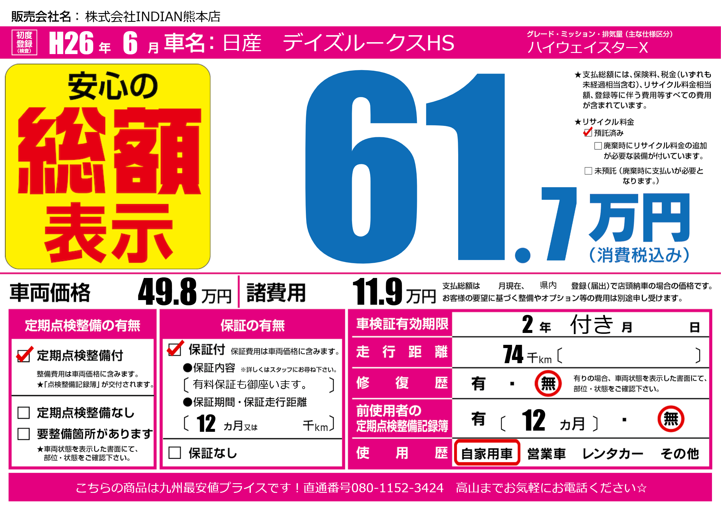| 車名 | 日産 デイズルークスHS | グレード ミッション 排気量 |