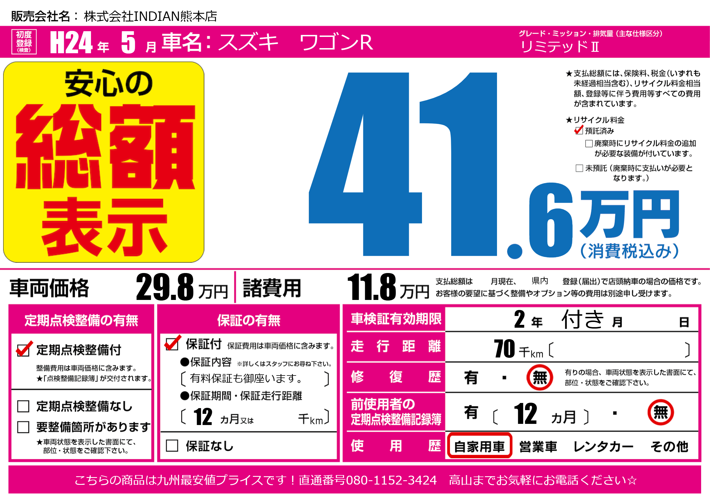 | 走行キロ | 7万km | 初年度登録 | H24年5月 |