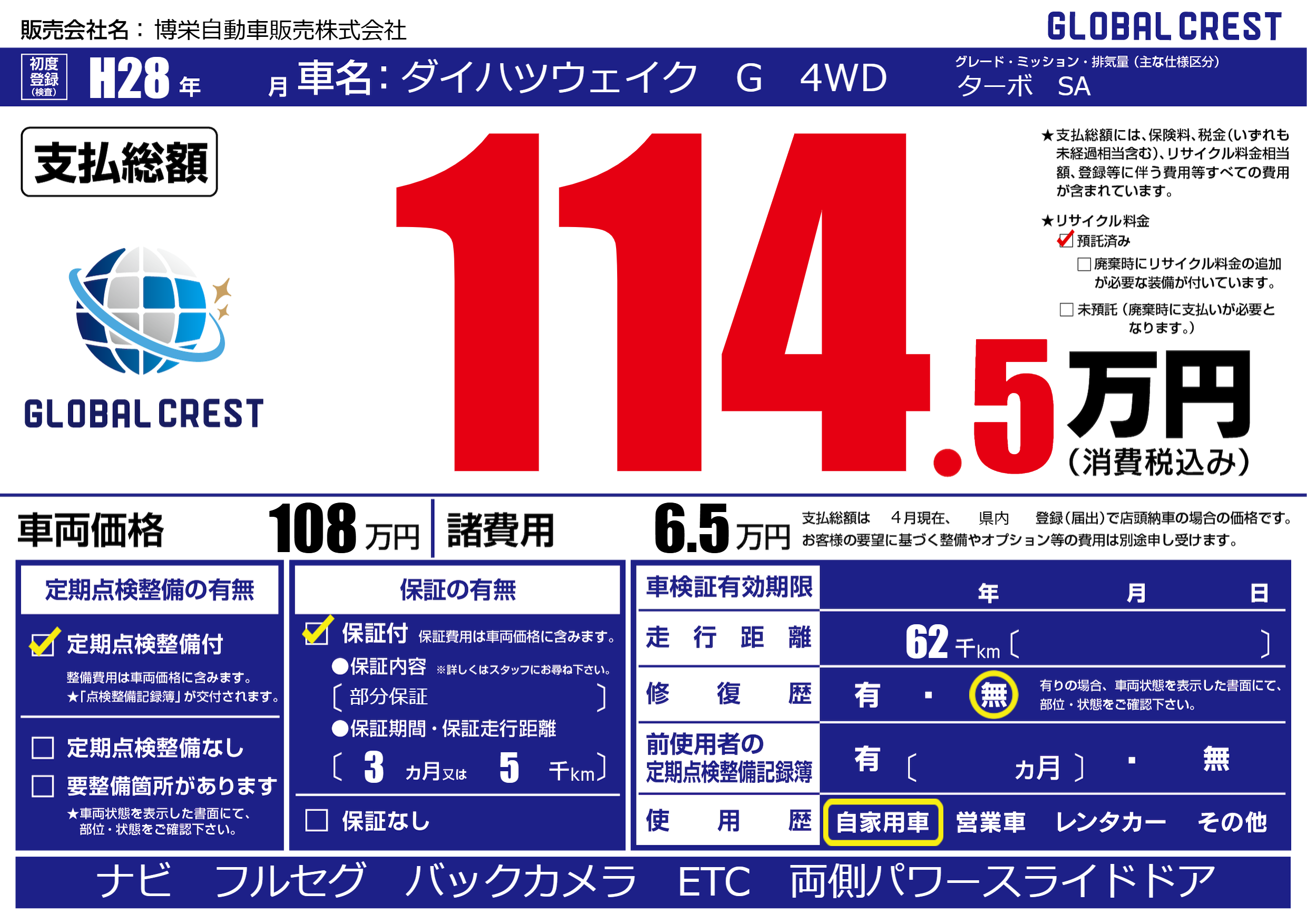 | 車名 | ダイハツウェイク G 4WD | グレード ミッション 排気量 |