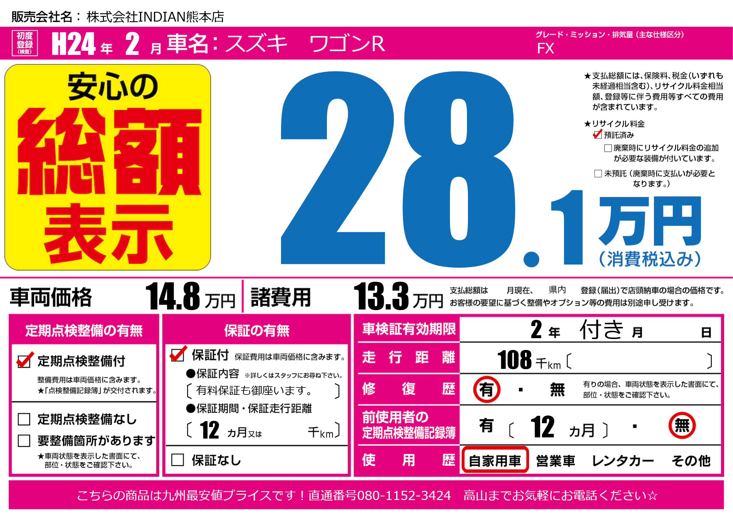 | 走行キロ | 10.8万km | 初年度登録 | H24年2月 |
