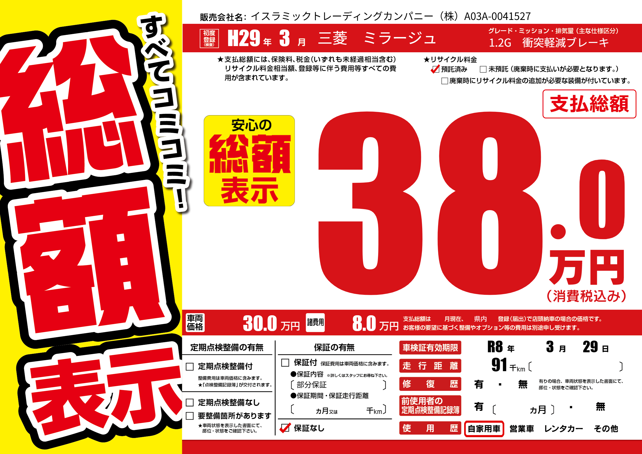 | 走行キロ | 9.1万km | 初年度登録 | H29年3月 |