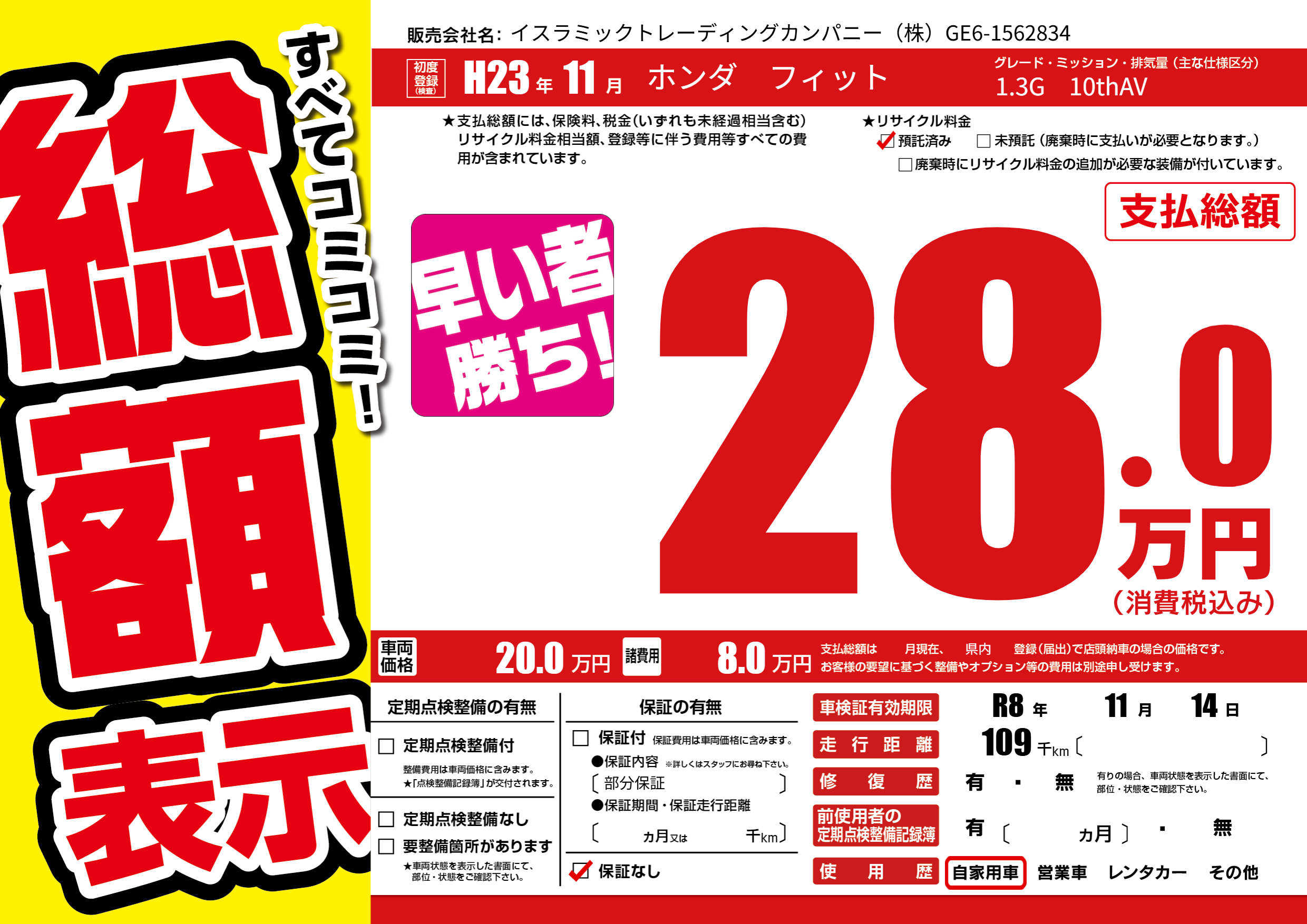 | 走行キロ | 10.9万km | 初年度登録 | H23年11月 |
