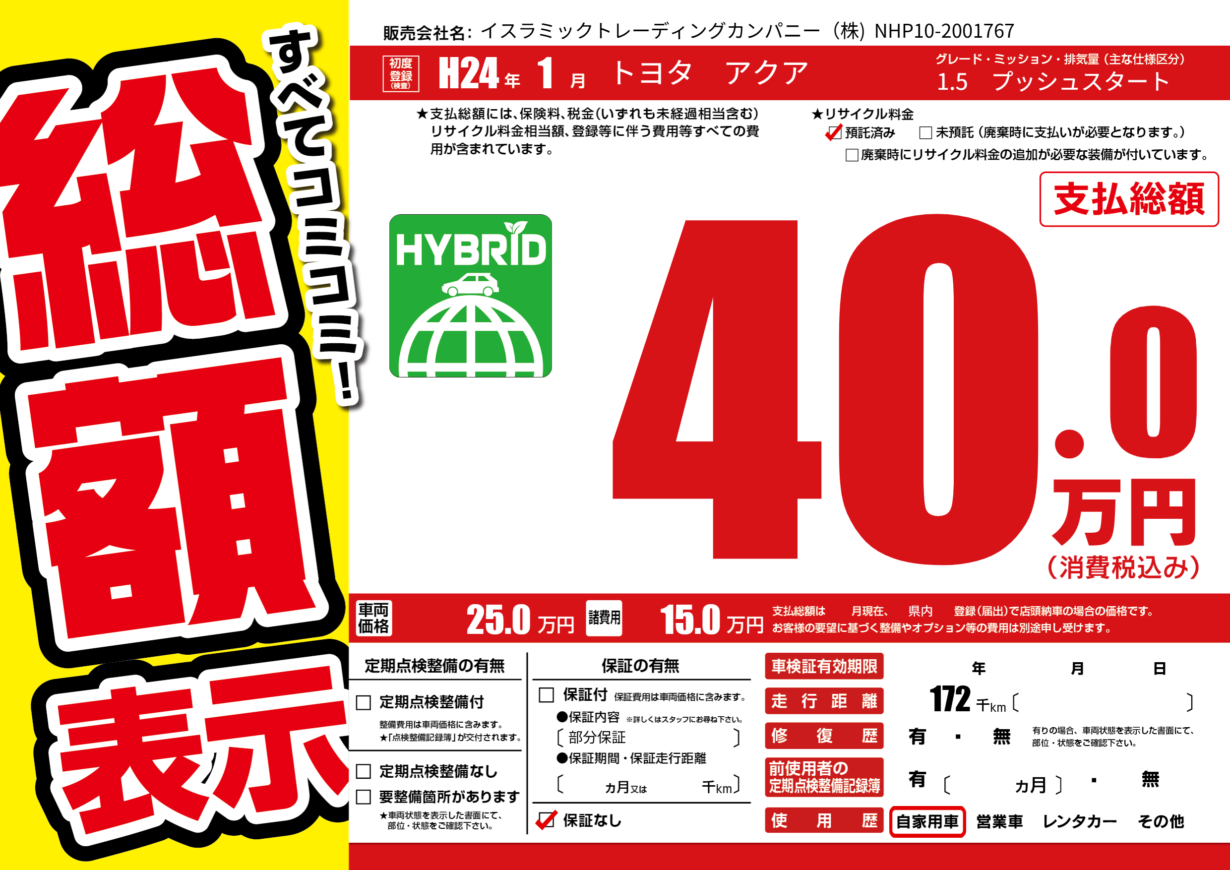 | 車名 | トヨタ アクア | グレード ミッション 排気量 |