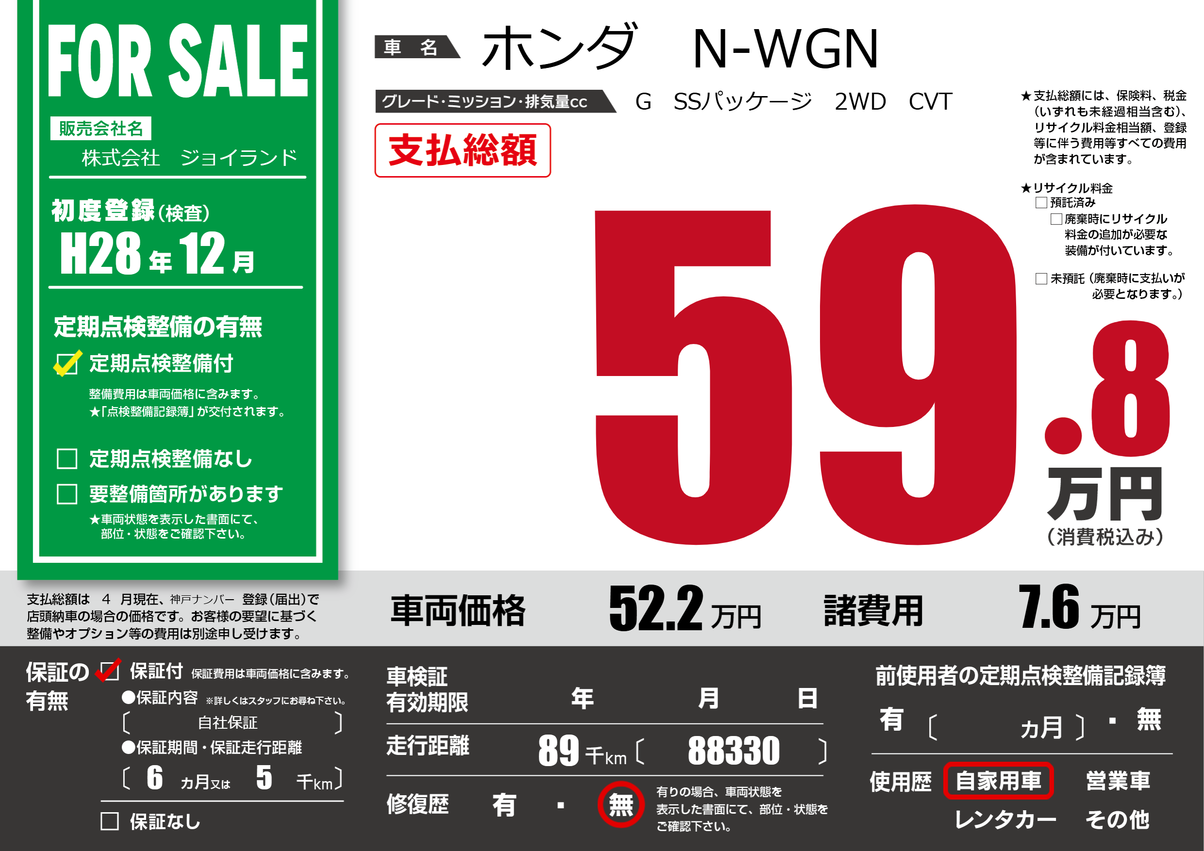 | 車名 | ホンダ N-WGN | グレード ミッション 排気量 |