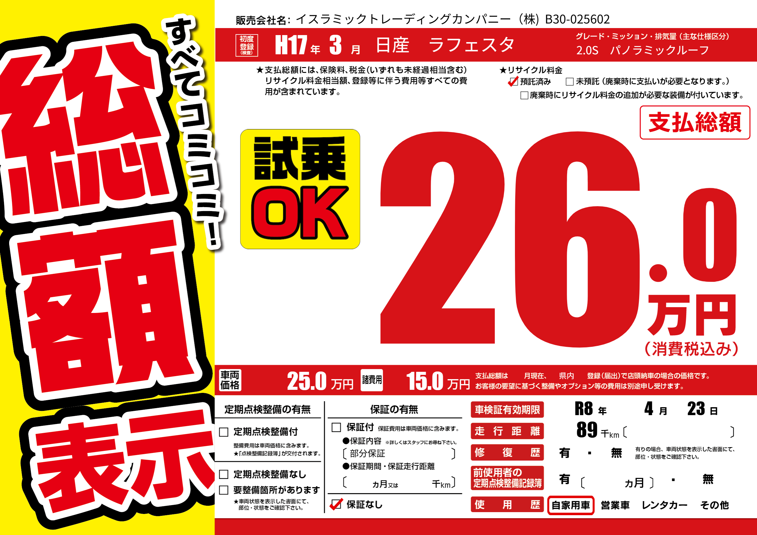 | 走行キロ | 8.9万km | 初年度登録 | H17年3月 |