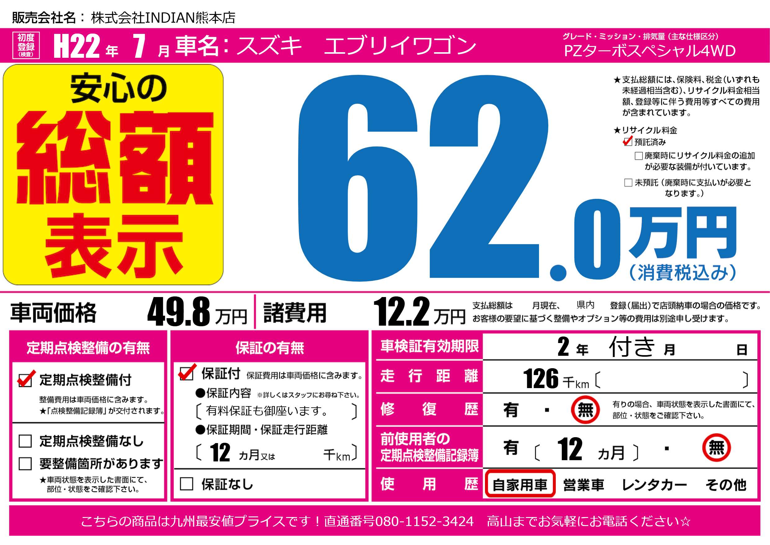 | 車名 | スズキ エブリイワゴン | グレード ミッション 排気量 |